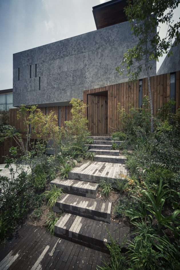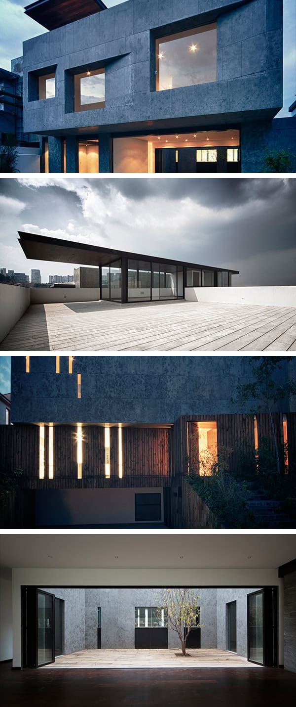 This single family residence is organized around a voided area that is also the focal point. It is developed around a large interior patio and there is plenty of natural light that fills all three floors. The hardwood flooring of  this rectangular concrete house and the planted trees symbolize the vacant volume.