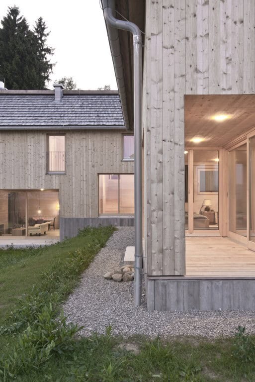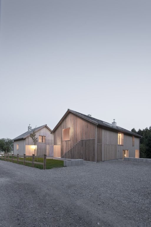In place of a modest masonry house with a neighboring stable evolved a small, freely grouped “hamlet” consisting of two residential buildings and a small storage shed. The original ensemble on the forest edge radiated an organically developed and relaxed atmosphere. Inspired by the “genius loci”, the architect reinterpreted the traditional rural timber buildings: For instance, the optical transparency in the vertical cladding of farm buildings is employed in the design of the front façade with the entrance area behind it. Several bench elements are integrated in and between the houses.