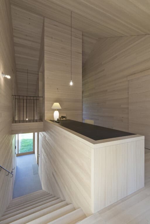 The garage door is flush with the façade and barely perceivable. The car disappears in all of its environmental detriments. As a counterpart to theclient’s city life, “a place of retreat and rural identity” should be created where “one is happy to arrive, relaxes, and departs recharged with energy”.