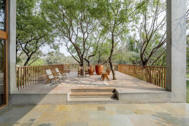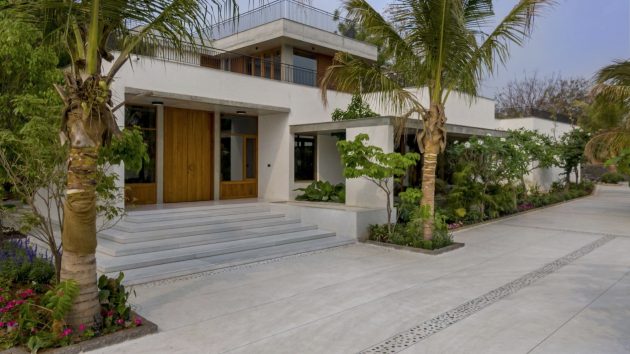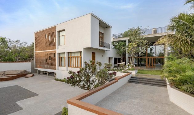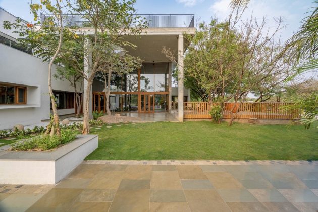 Inspired by water’s fluidity, the plan weaves organically across the land, curving around monoliths and trees. The low-slung form ensures the residence nestles into the landscape without imposing on it. The height of the structure was consciously kept lower than surrounding trees, a symbolic and functional gesture that reflects deference to nature and reduces heat gain.