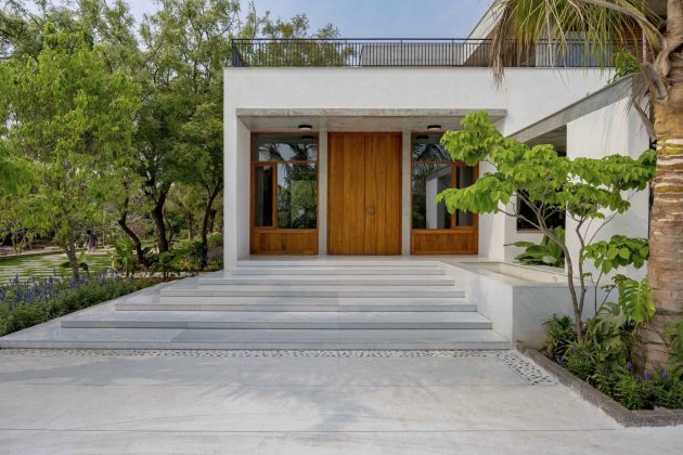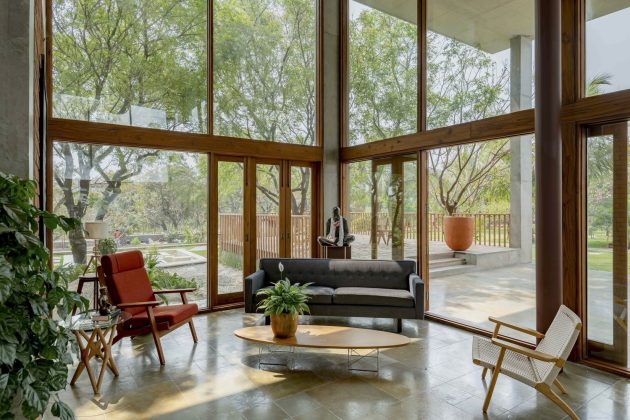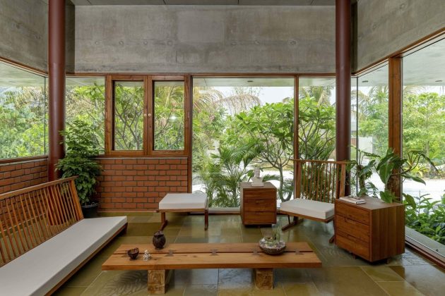 These are complemented by the elemental presence of sunlight, air, and greenery, turning the house into a living organism rather than a static shelter.