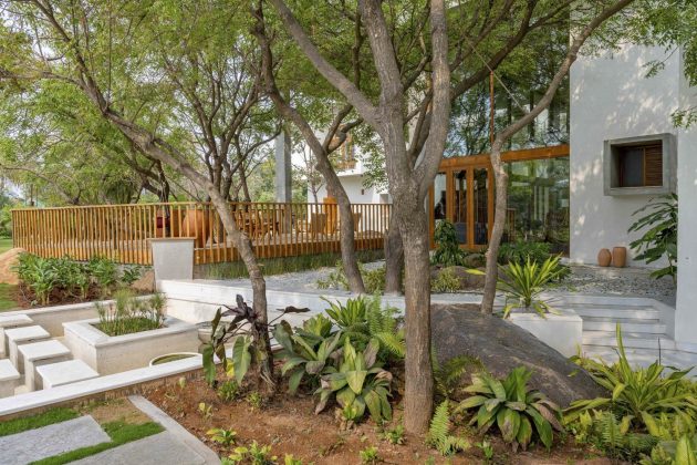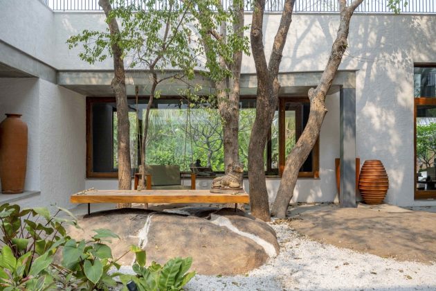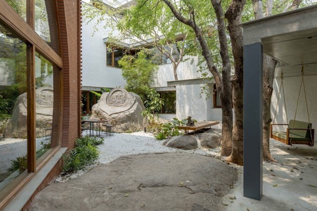 Throughout the site, skewed walls and cut-outs allow trees to pass through the architecture and sunlight to enter gently—illustrating a design that listens to its context. A massive rock embedded in the living room, partially inside and partially in the courtyard, becomes a poetic focal point.