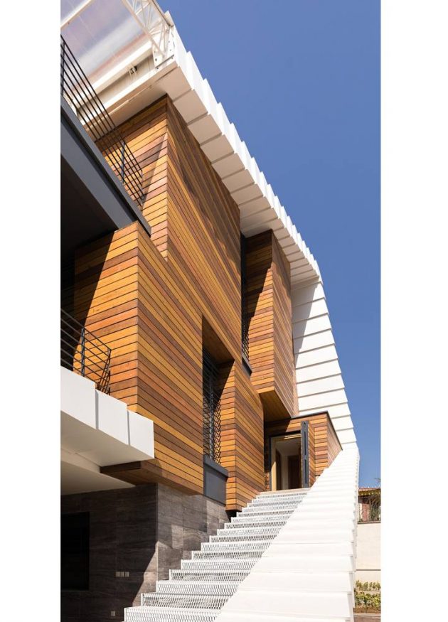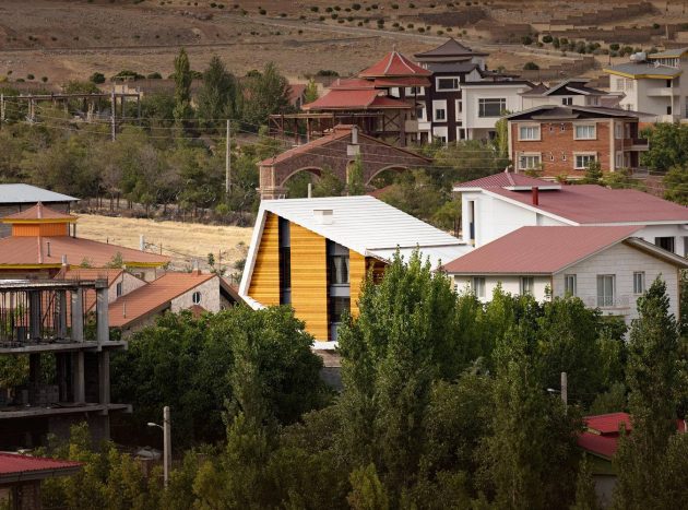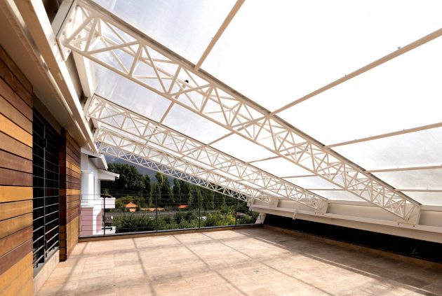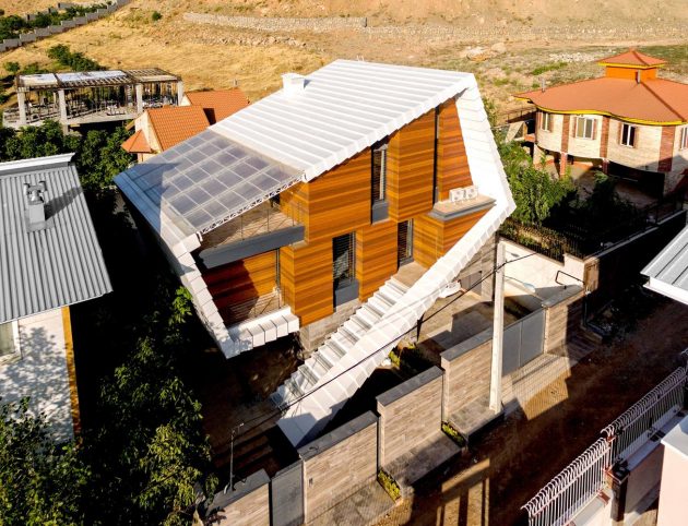 A large terrace offering an expansive view was one of the main design goals facing the southeasterly direction which is the best side for viewing the garden city of Damavand. The height restriction of the sloping roof and having the optimum slope regarding the aesthetic and functional needs would have resulted in a height shortcoming in the terrace. In response to this problem, a mechanically inclinable sloping roof is designed that is also wind-resistant and economical.