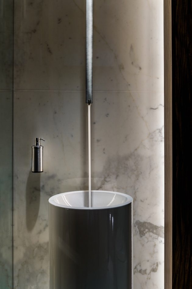 From the architects: “Nearby inspiration came from both the 1979 Tarlo ‘Wall’ House by Tod Williams and Norman Jaffe’s Perlbinder House, completed in 1970. The two story travertine entry façade is highlighted with a single opening accentuated by a cantilevered afromosia stair landing that hovers off the ground.”