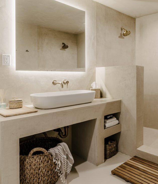 What is astonishing about this house is the way that woven elements are so greatly involved throughout the place, like baskets, lampshades, and rugs. Just beautiful with so many details in the background in every single room. Like, that backlight mirror in the bathroom? What a brilliant move!