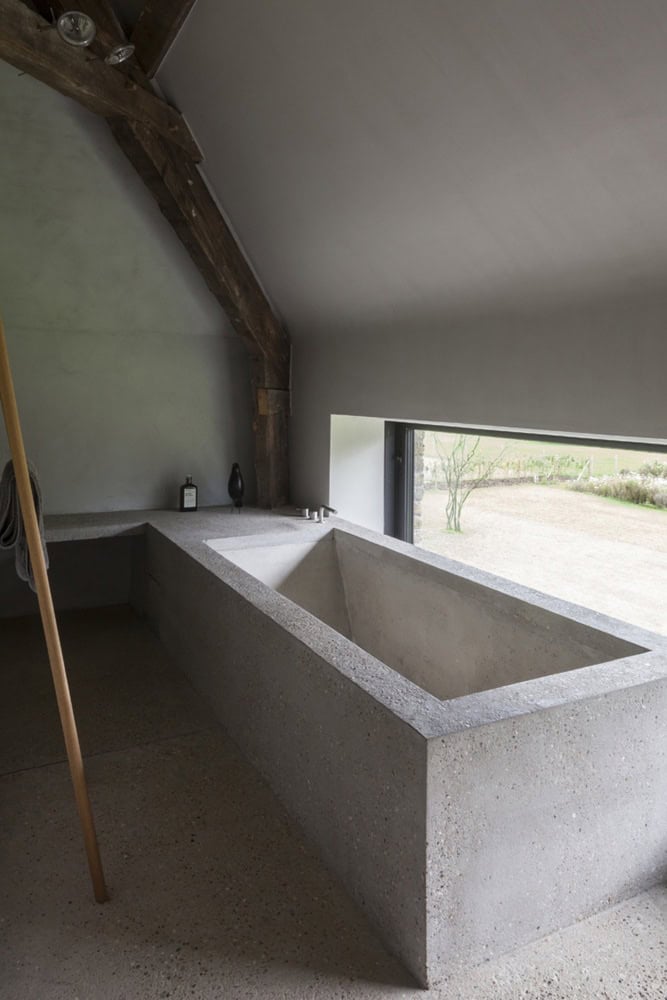 “Not only the materials of the outer skin but also the enfilade of spaces of the new volume reflect the local architecture of long farmhouses. Following the same theme, the rough scrubbed concrete and the softly rounded plastering is in subtle contrast with the exposed, restored timber roof frames and the newly added, but equally wooden interior volumes. Just as a fortress introverts itself for protection, the reading and working spaces are equally oriented towards the inner yard. The border between inside and outside fades because of the perpetuation of the washed concrete flooring reminiscent of cannon bases. As antithesis of a bastion the living spaces open up to the polders outside the former bulwark.