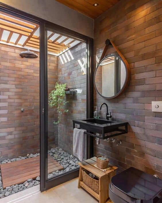 The use of wood and stone coverings is the highlight of this style of decoration, and the bathroom is no different. As long as a balance is found, wall cladding with stones, exposed bricks, and wood can be an option. Reminiscent of the farmhouse atmosphere, pieces of wood can be reused and treated to assemble a bench, a niche, a shelf, and other objects in the bathroom. The union between these rustic elements and materials from the industrial decoration style is also harmonious, as you can see below.