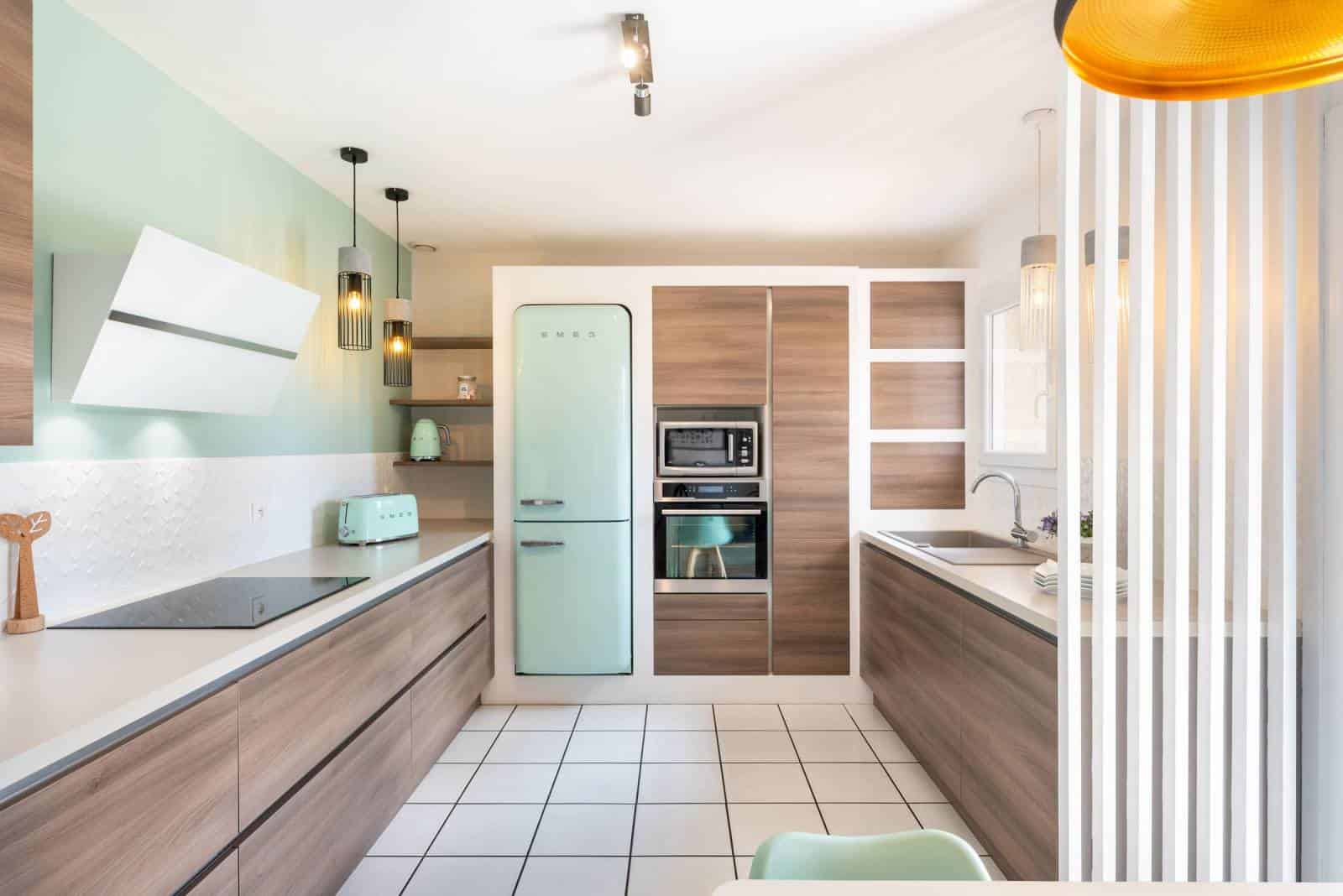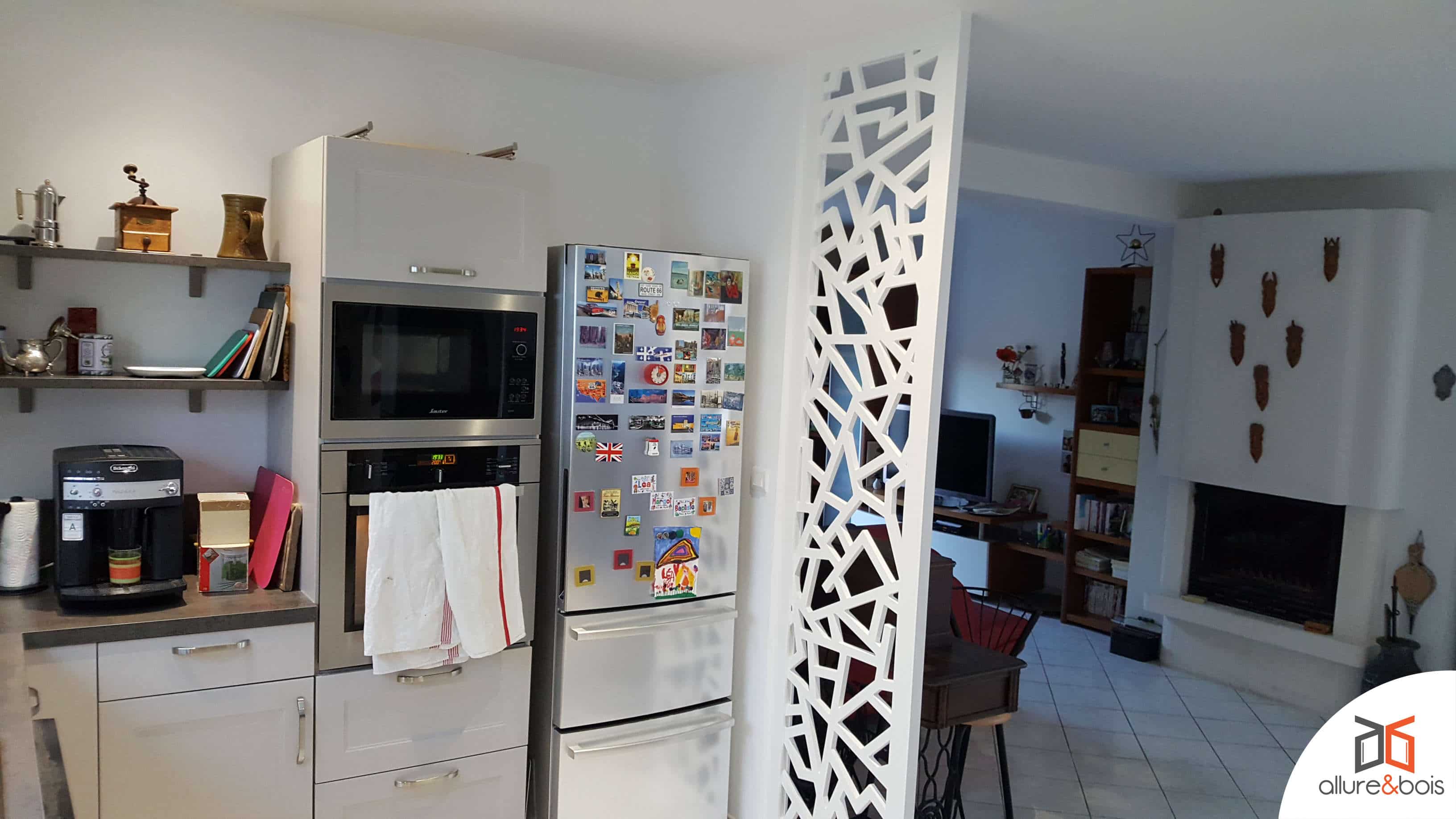 More decoration than anything else, the partitions can allow you to dress the sides of your kitchen. Often the furniture boxes are white and are not designed so that the side sides are decorative. (Most of the time, they are stuck against a wall, we don’t have to worry if it looks nice or not). But as kitchens have tended to open up and break away from unnecessary partitions, you may want to dress your kitchen furniture. In this case, we are on a screen format much smaller than the two previous uses since the screen will be the same length as the depth of your furniture. What is interesting in this arrangement is that it only partitions very little. We are more in the idea of delimiting spaces than strictly speaking partitioning.
