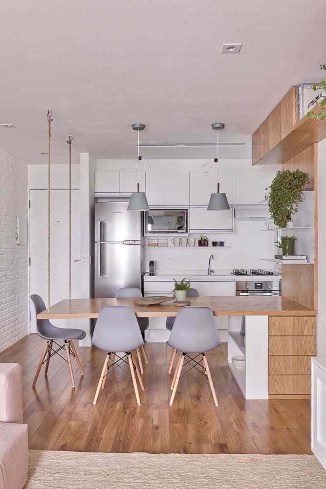 A kitchen integrated with the dining room has several advantages, such as facilitating the preparation and the time to serve the meal, even dispensing with a counter in the kitchen. When decorating, remember that styles do not have to be the same, but they must be harmonious. The dining room can have that more inviting and cozy feel, while the kitchen can bring more functionality and practicality.