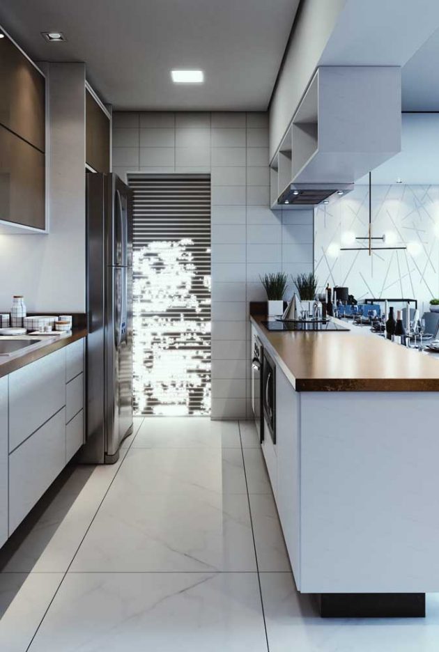 The interesting part of the kitchens integrated with the laundries is that it is always possible to install a sliding door between the rooms so as not to expose the service area unnecessarily.