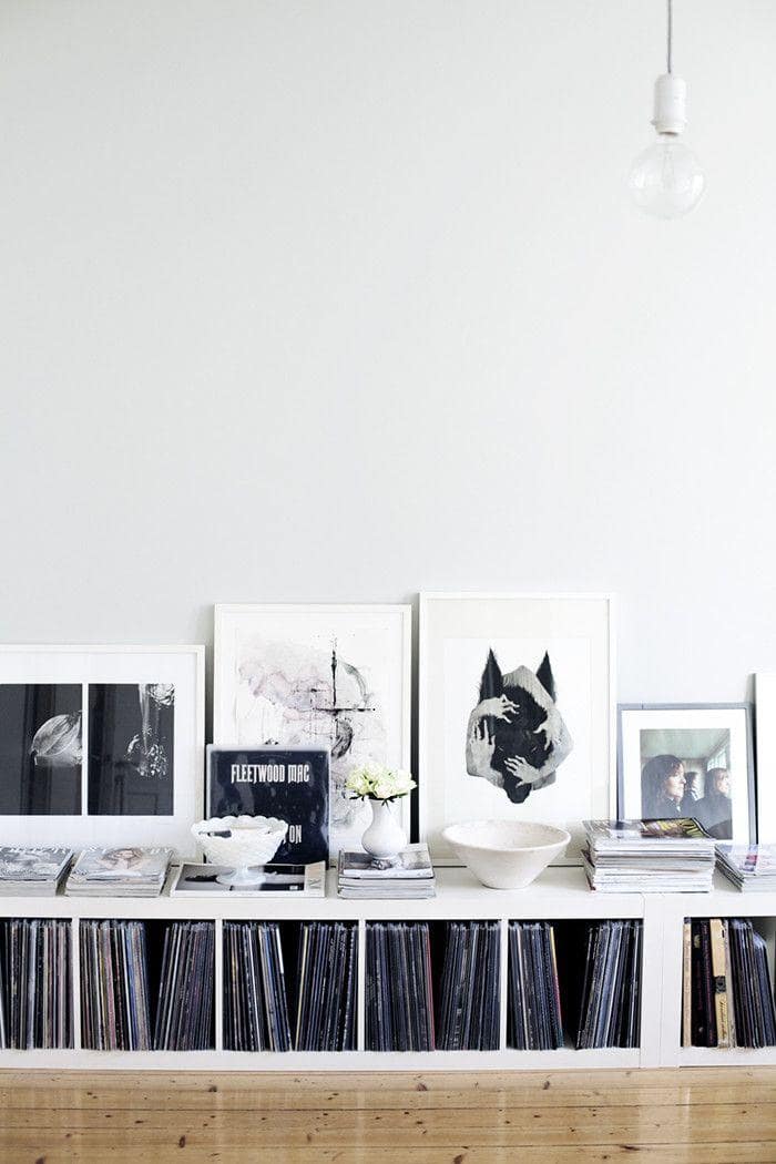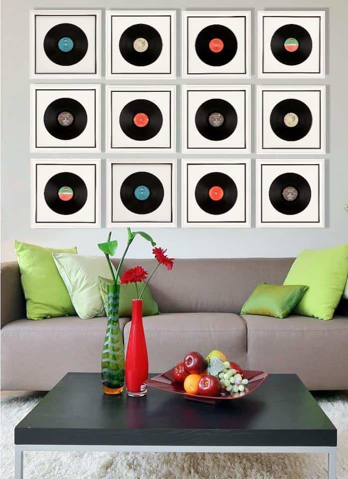 The vinyl record refers to a more youthful style. If you want something more stripped down, opt for a vinyl composition on the wall in a distributed way. If the proposal is something more retro, the interesting thing is to make a corner with some furniture to support the pieces of vinyl next to the device.