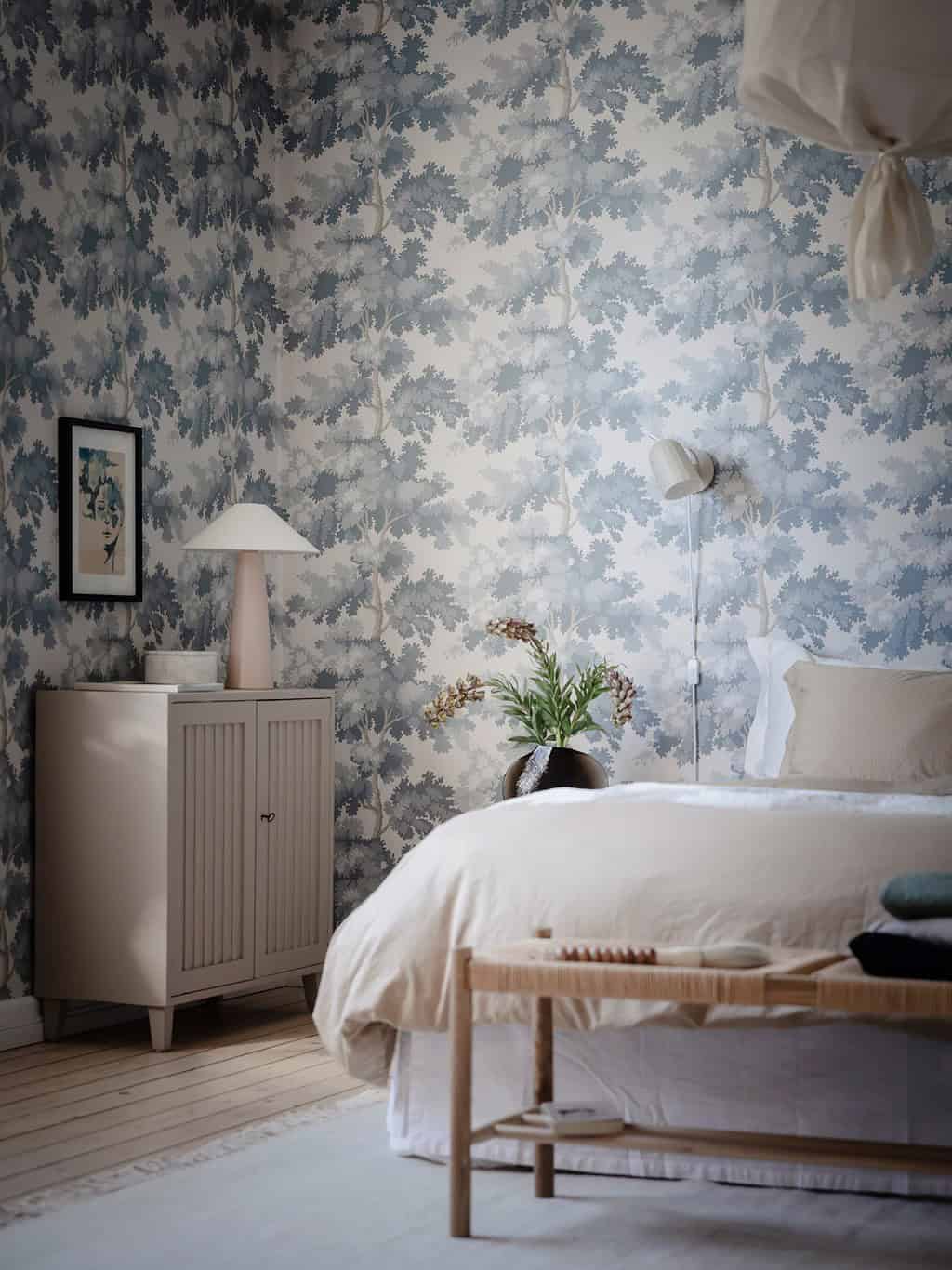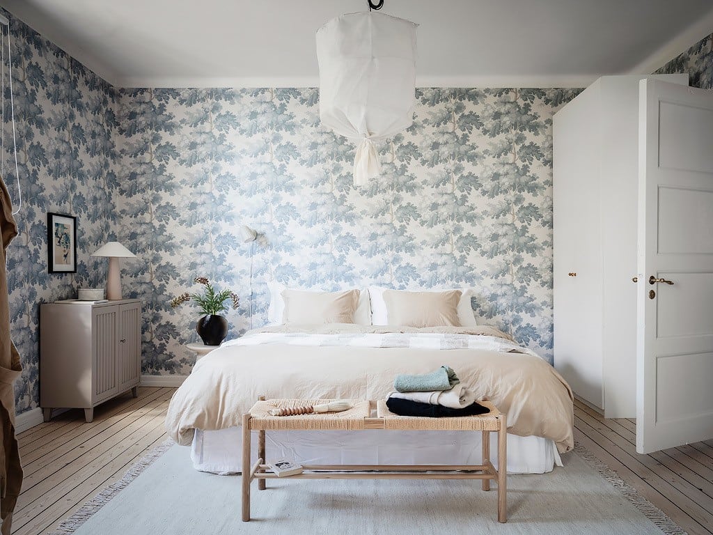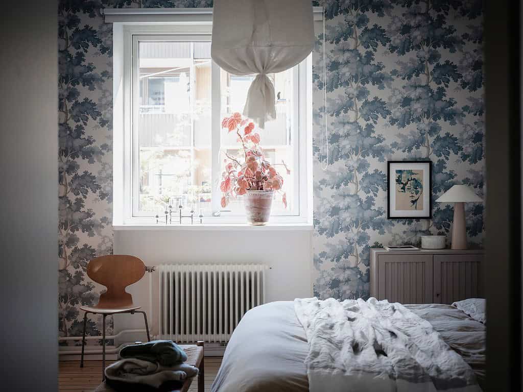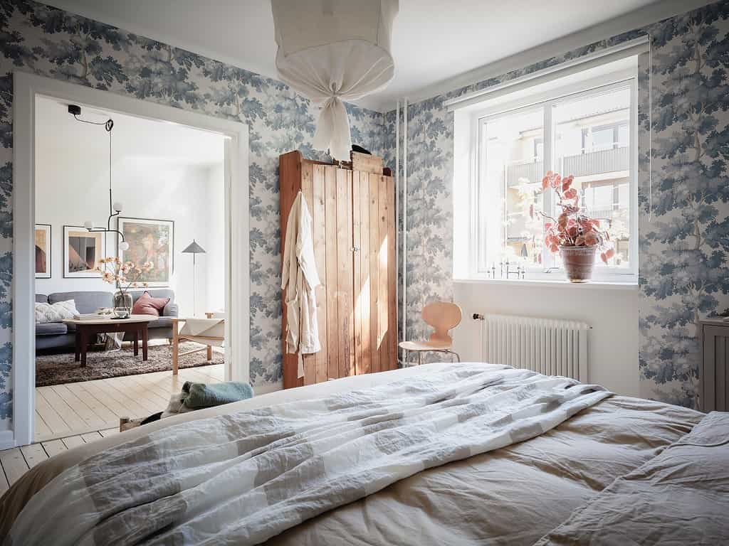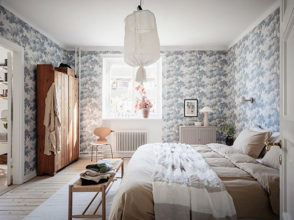 There are so many elements in this bedroom that we like, that we don’t know where to start because we don’t want to leave any of them. What catches your attention the most? That wonderful wallpaper painted with floral motifs in blue tones that evoke the sea and the sky of the Nordic countries? Or the old, natural wood slatted wardrobe with box office airs? Or the soft natural cotton fiber textiles on the bed, the floor, and the lampshade? Or the Ant three-legged design chair? Wherever we look, there is something to highlight and it fits perfectly into the set.