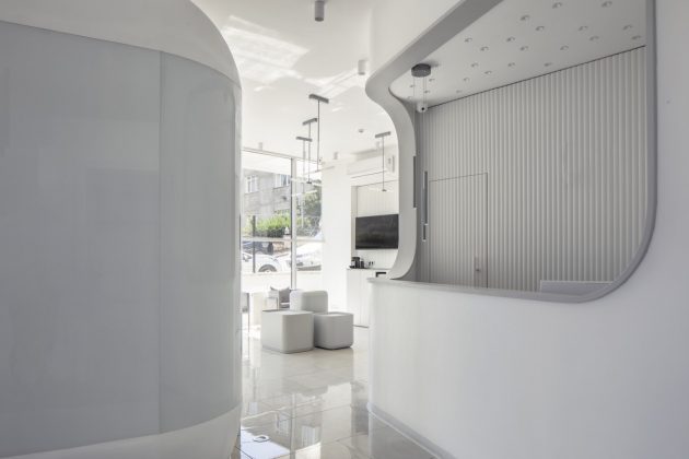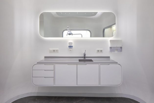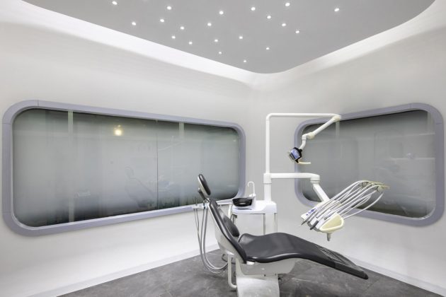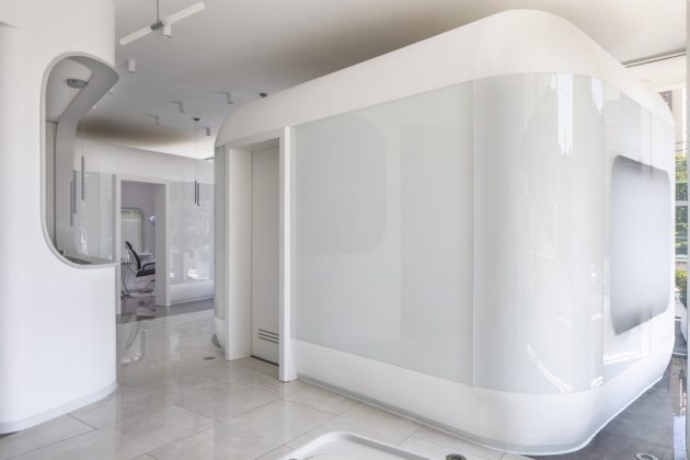The design of the dental rooms are designed out to be like capsules inside the clinic with explicit doors for openings to the cubes. The rounded corners of design bring a smooth quality and touch lightly to the floor. The materiality on the floor changes around the boxes emphasizing their particular shape. The entrance hallway is marked with this change in the floor leaving a defined space for self-standing semitransparent exhibition units. The lighting elements are creatively chosen according to the nature of the design; just like the star-like mini spots inside the examination rooms.