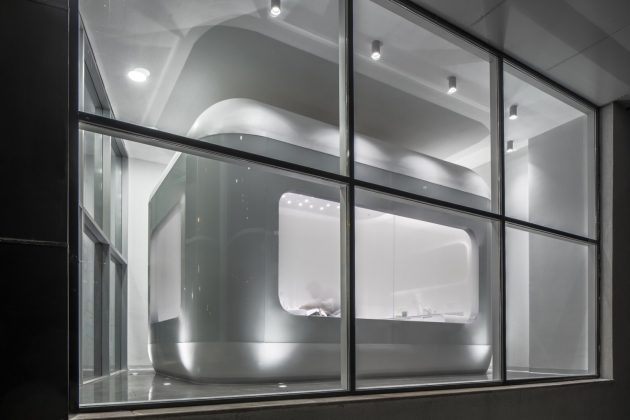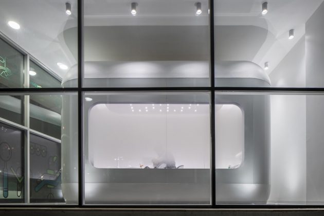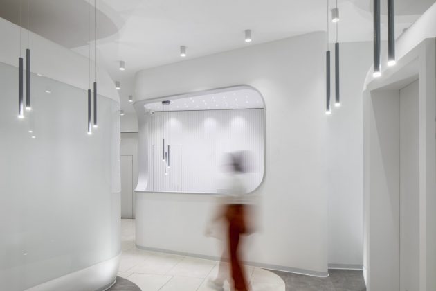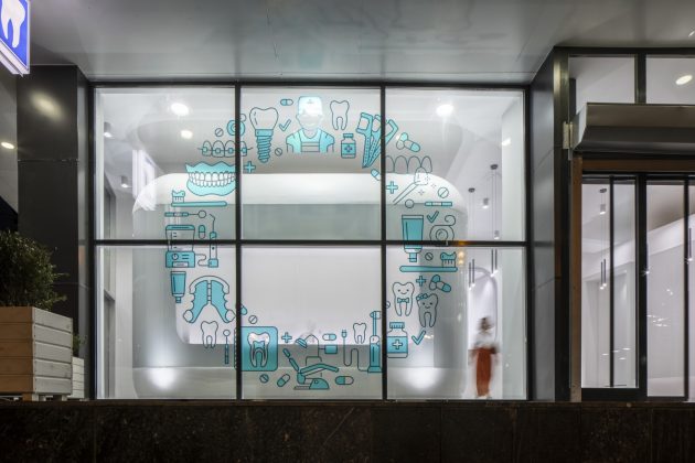 The spacious high ceiling space within the existing building has inspired the designers to fit inside with self-defined height of clinic rooms that are identical flying boxes within the space. These boxes are a showcase of dental rooms and with gradient glassed facade design they enable privacy.