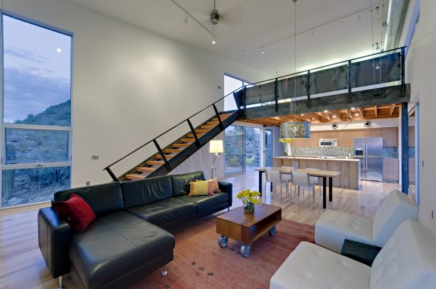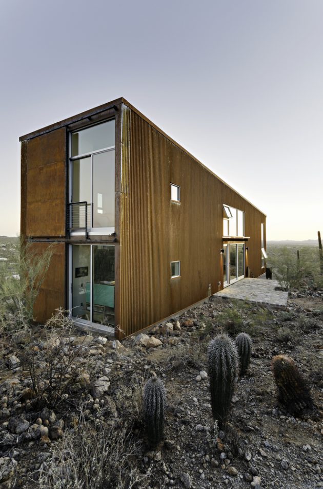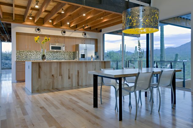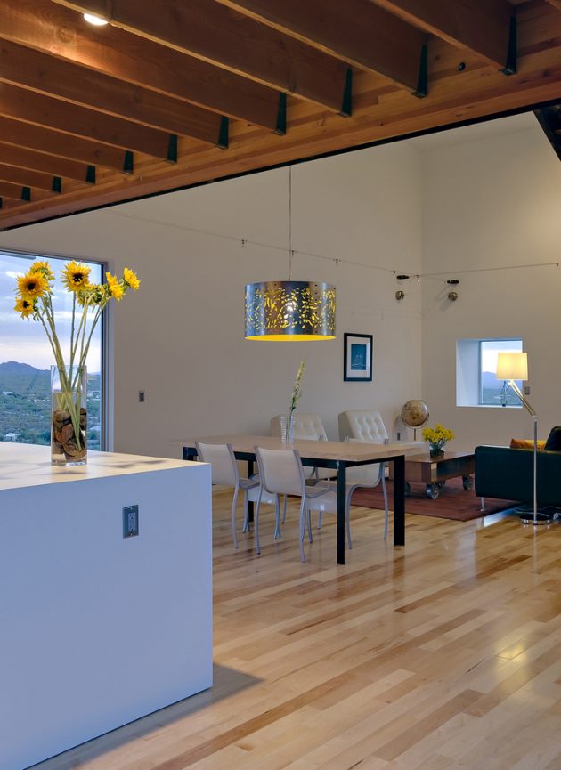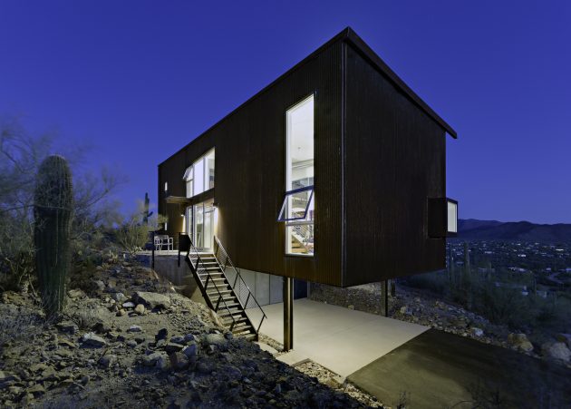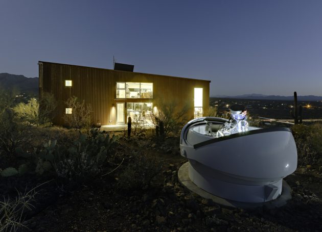 Rob Paulus Architects have designed the Diamond Head Mountain House – a compact modern residence set in a stunning environment. The 2,030 square feet dwelling is designed for an astronomer and is placed in the mountains of Tucson, Arizona. The sloping site enables the home to present views of the rugged terrain all around and there is also an observatory on top of the hill that is connected with the home in order to enable remove viewing of the stars.