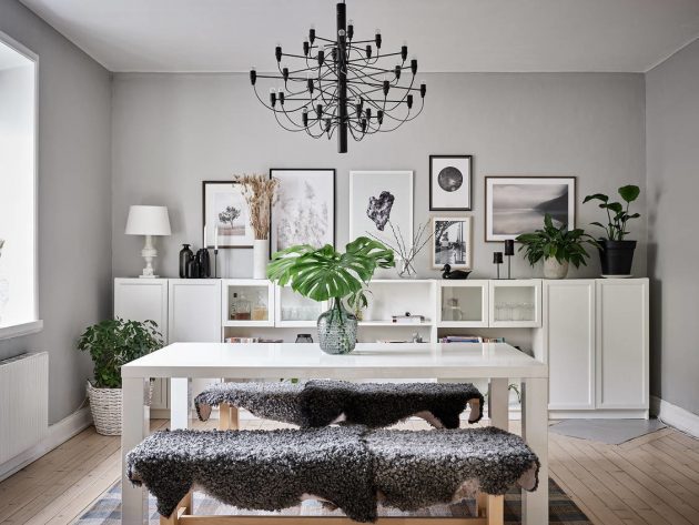 We really like the Nordic dining style, cold and mountain air provided by those gray-dyed lambskins on the bench in this dining room, without them it would be more clinical and impersonal, but with the fur, you add warmth and comfort.