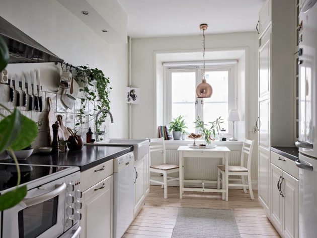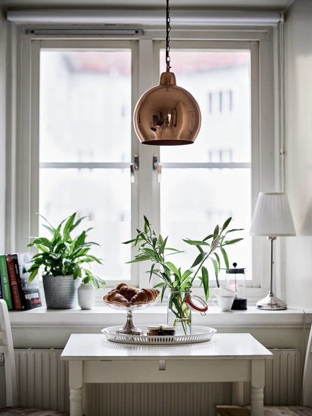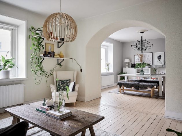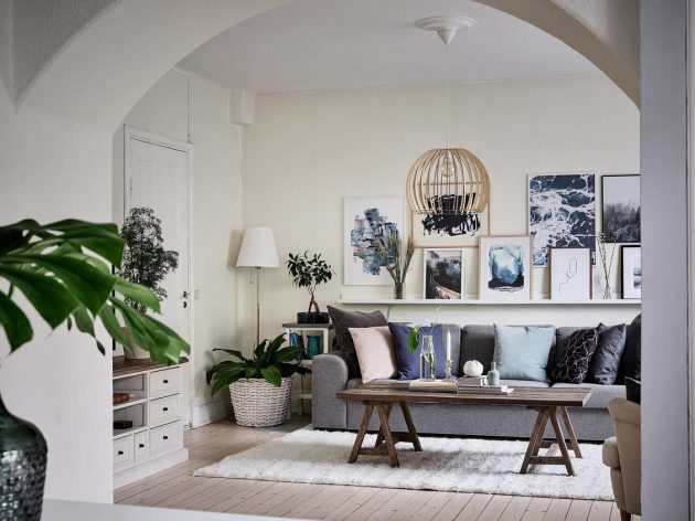 If you follow the rest of the tour of this 68 m² apartment in Gothenburg, Sweden, you will surely see other elements that you will like, such as the separation between the dining room and the living room, the kitchen with that cupboard and everything exposed or the bedroom, tiny, but very well dressed.