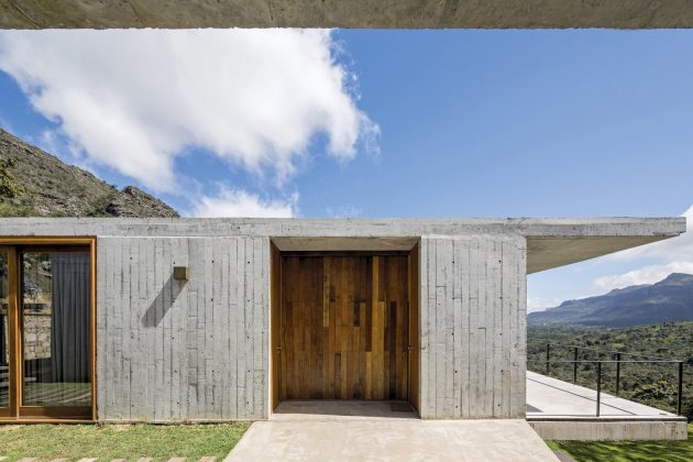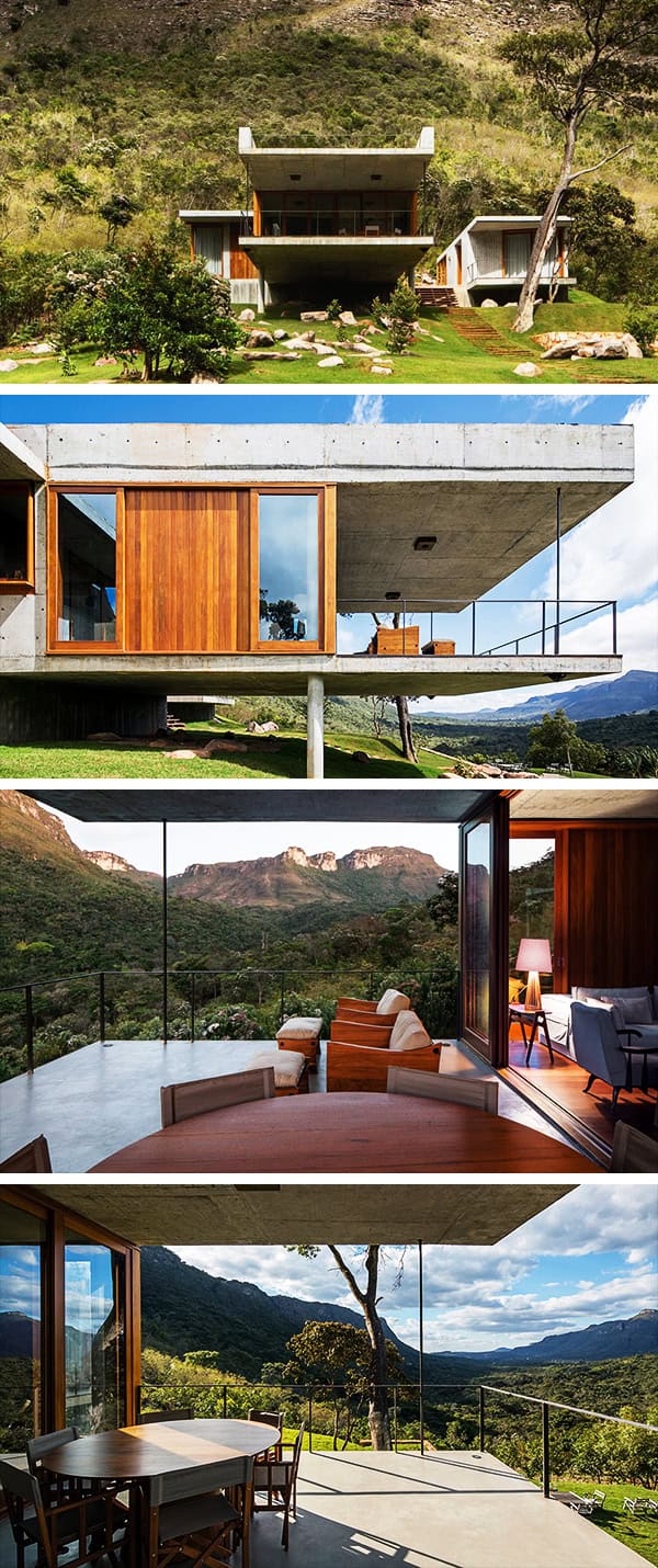 A suspended volume structure arranged in a longitudinal manner is the main principle of the design of this residence which is constructed mainly from concrete but also uses wood for framing and facade accents.