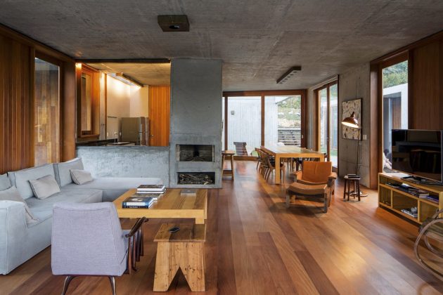 Therefore, one can understand how the materials act as protagonists in this design by observing the relation between the concrete found in the structure and walls and the wood of the frames, exterior panels, flooring and furnishings. It is interesting to explore the temporal aspect of said materials, as the behavior of each element over the years will transform the architectural set into a component integrated to the landscape. Darkened concrete, aged wood and mature landscaping, will serve as a statement of how the man-nature symbiosis slowly evolved in the valley environment.