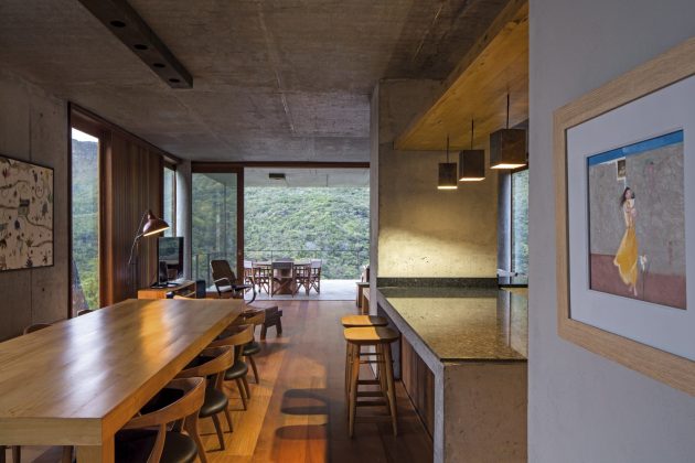 Therefore, the house is accommodated on a small cut in the topography in the posterior portion of the lot and projects over the slope, reaching a distance of 3.5 meters from the ground at its farthest end from the anchoring point.