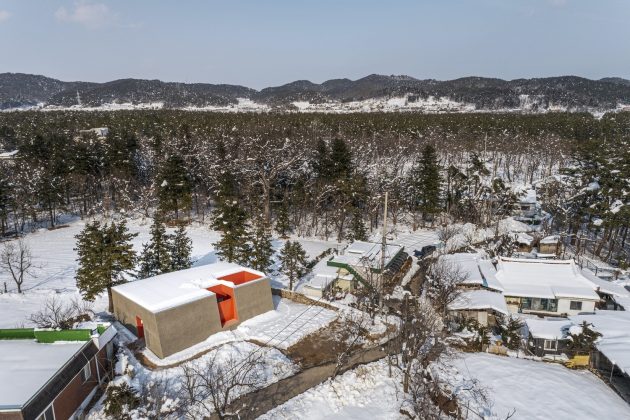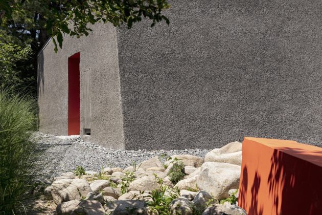 Perched along a gently sloping site near the forest edge, Doldam House rises from the ground like a weathered boulder. Its monolithic form follows the contours of the land rather than imposing a geometric grid. The structure’s massing is angled, fractured, and grounded — a direct response to wind direction, topography, and sunlight.