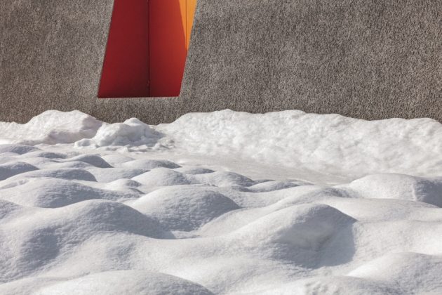 In contrast to the somber grey exterior, the entrance and internal details glow with a vibrant burnt-orange hue. This striking accent is not an arbitrary flourish; it symbolizes warmth and human presence amid the coolness of stone. It evokes the autumn leaves of the surrounding forest and the inner life of the house — a reminder that architecture can hold both weight and warmth.