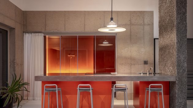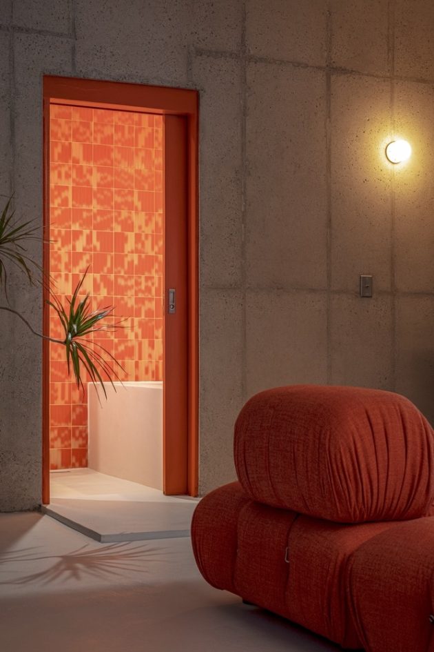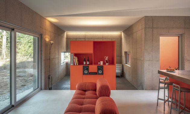 Inside, the mood shifts from monumental to intimate. Exposed concrete surfaces contrast with warm wood and the signature orange panels used for built-in furniture, sliding doors, and cabinetry. This restrained palette highlights the changing light and enhances the spatial depth.