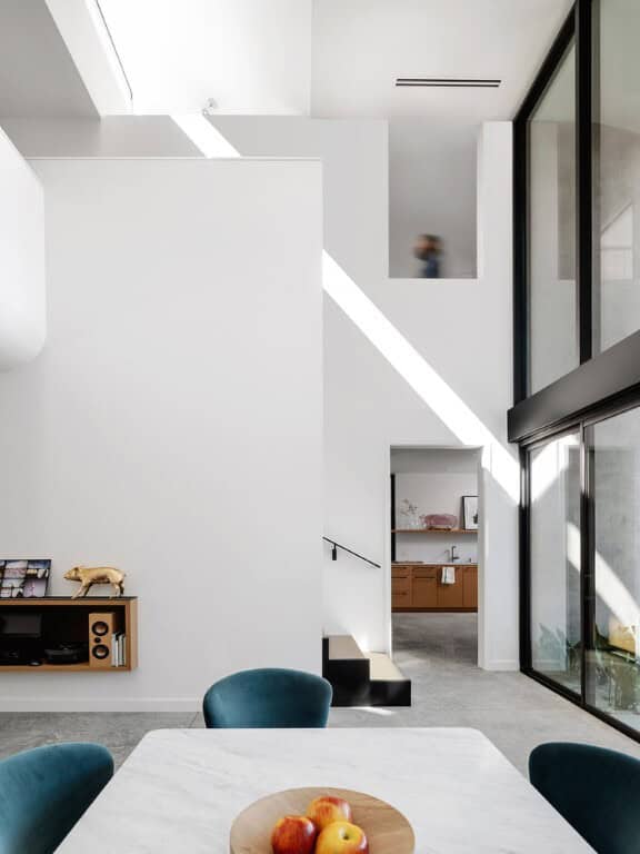At the core of the home is a double-height dining area, illuminated by expansive glazing that opens directly to the courtyard—blurring the line between indoor and outdoor living. This connection is enhanced by a southern clerestory window that channels sunlight deep into the interior, balancing light throughout the year.