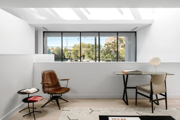 Upstairs, a cozy den overlooks the dining space and garden, maintaining vertical visual connection while offering a distinct retreat.