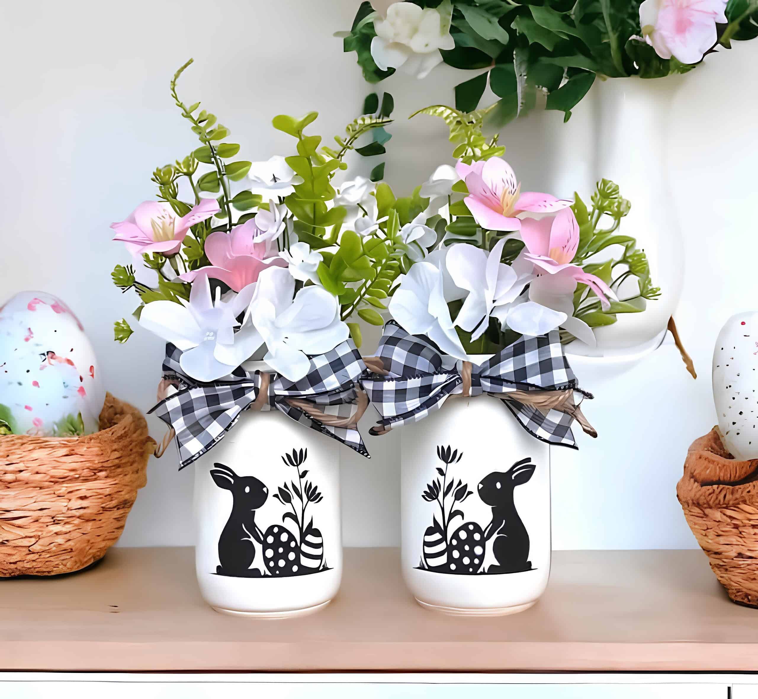 White mason jars with black bunny silhouettes, filled with spring flowers and tied with black-and-white gingham bows