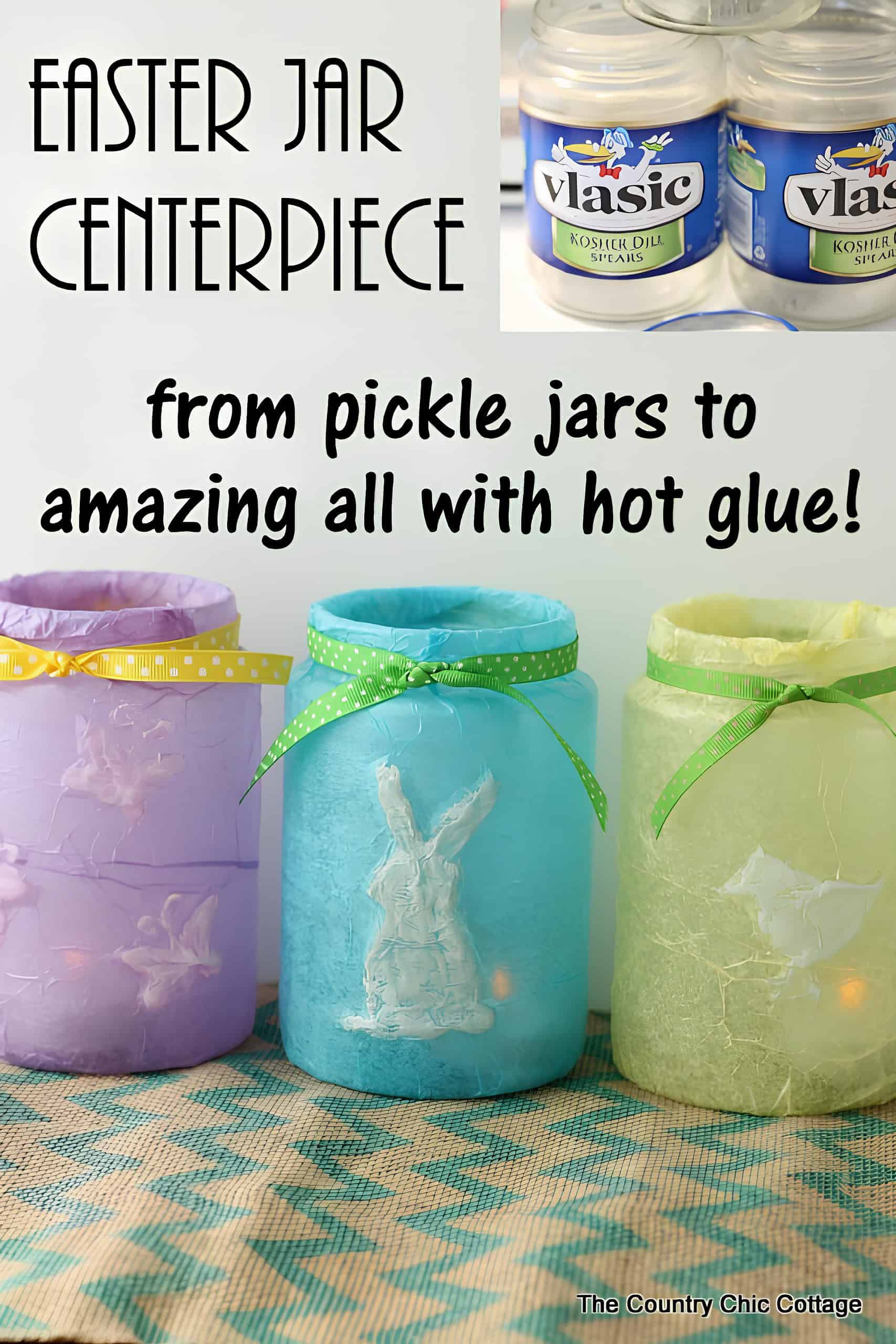DIY Easter centerpiece jars made from upcycled pickle jars, covered in pastel tissue paper with hot glue bunny designs and ribbon