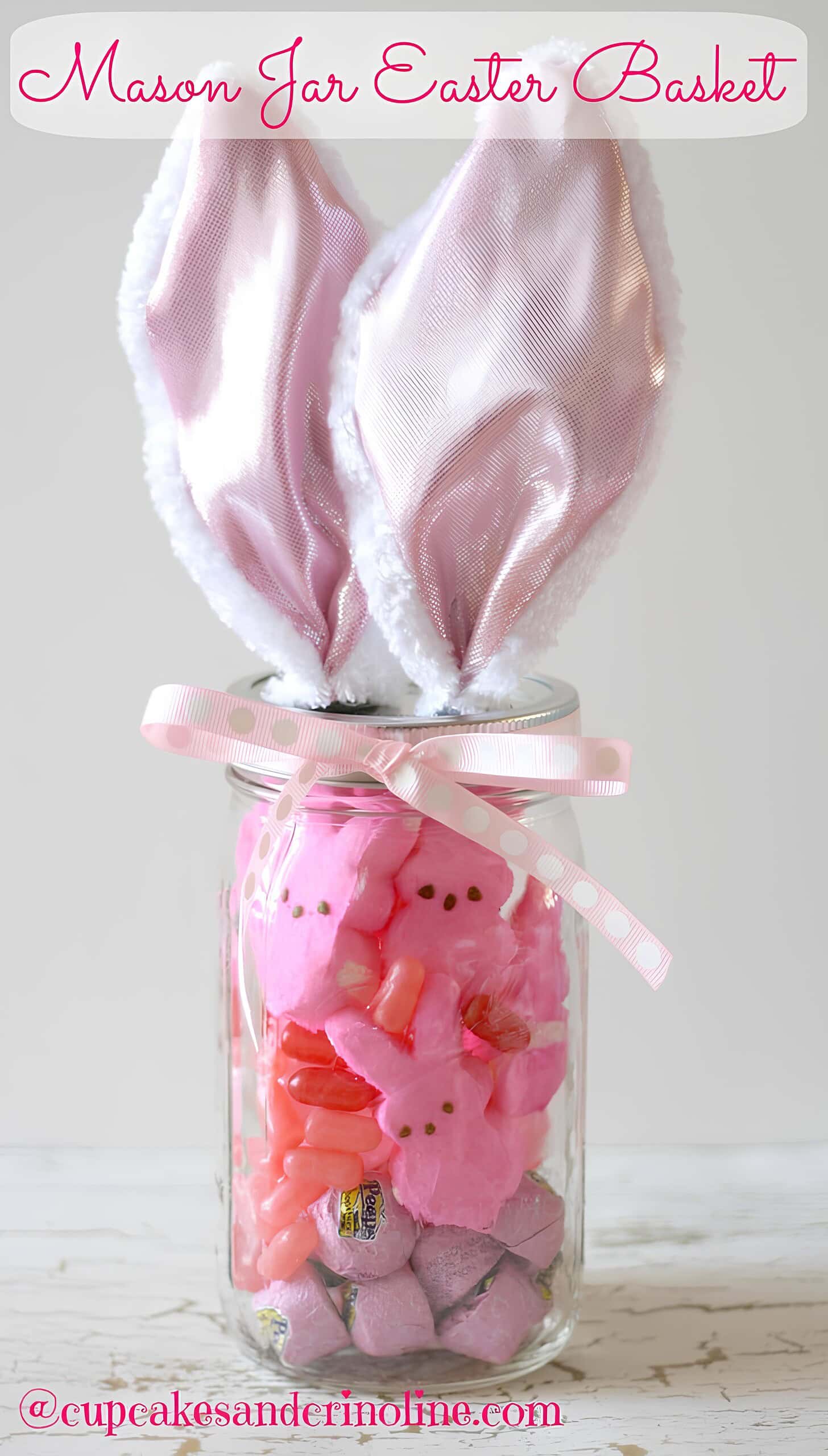 Mason Jar Easter Basket With Bunny Ears And Pink Candy Peeps