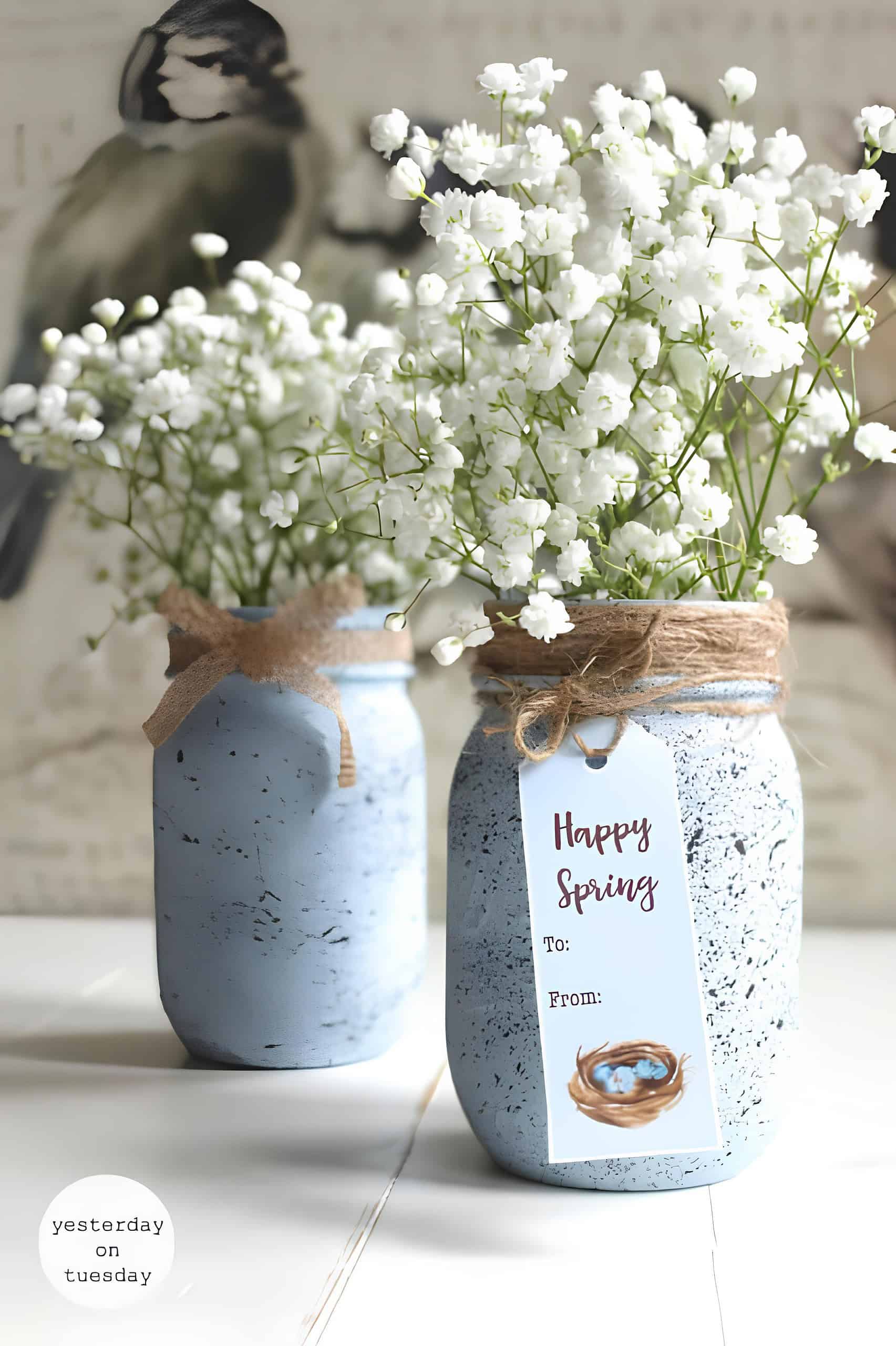 DIY spring mason jar vases painted blue and filled with baby’s breath flowers