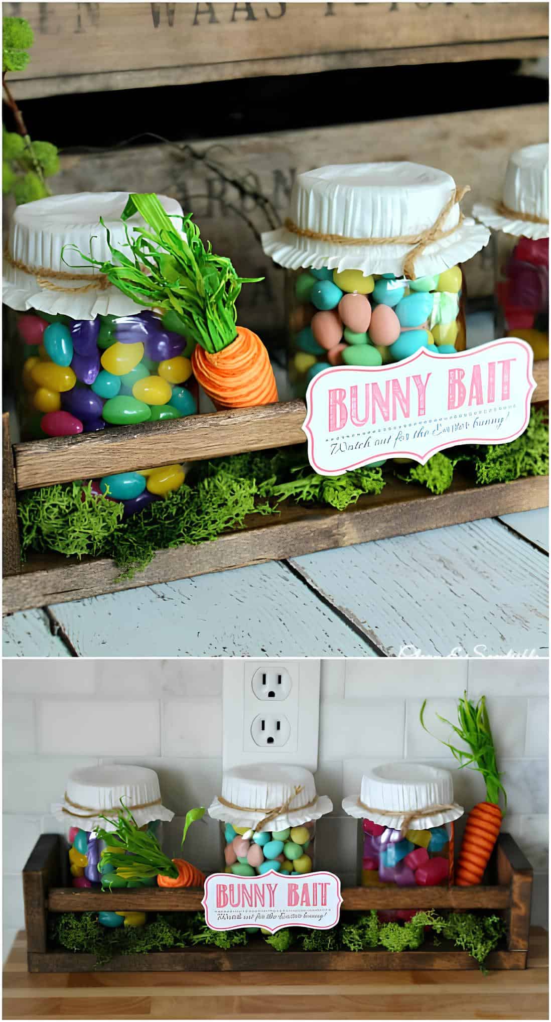 Rustic Easter candy display with mason jars labeled Bunny Bait filled with colorful jelly beans and eggs