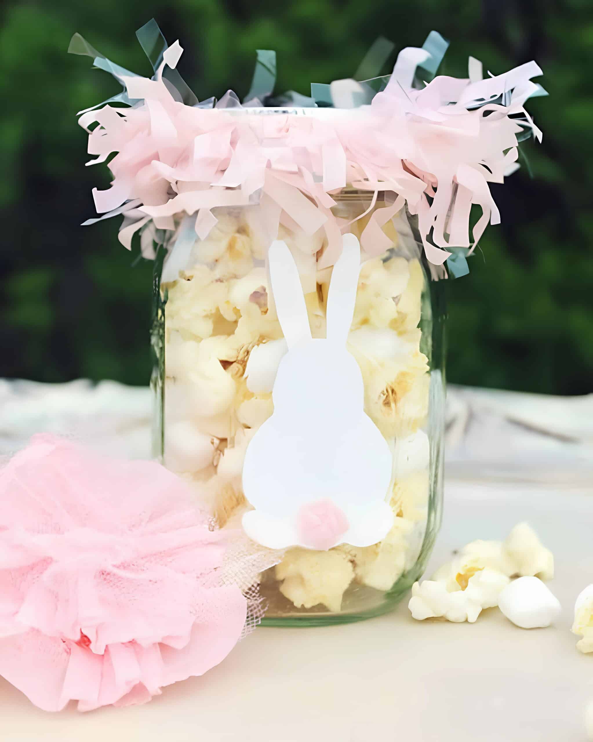DIY Easter bunny popcorn mason jar with pink paper fringe and white bunny cutout