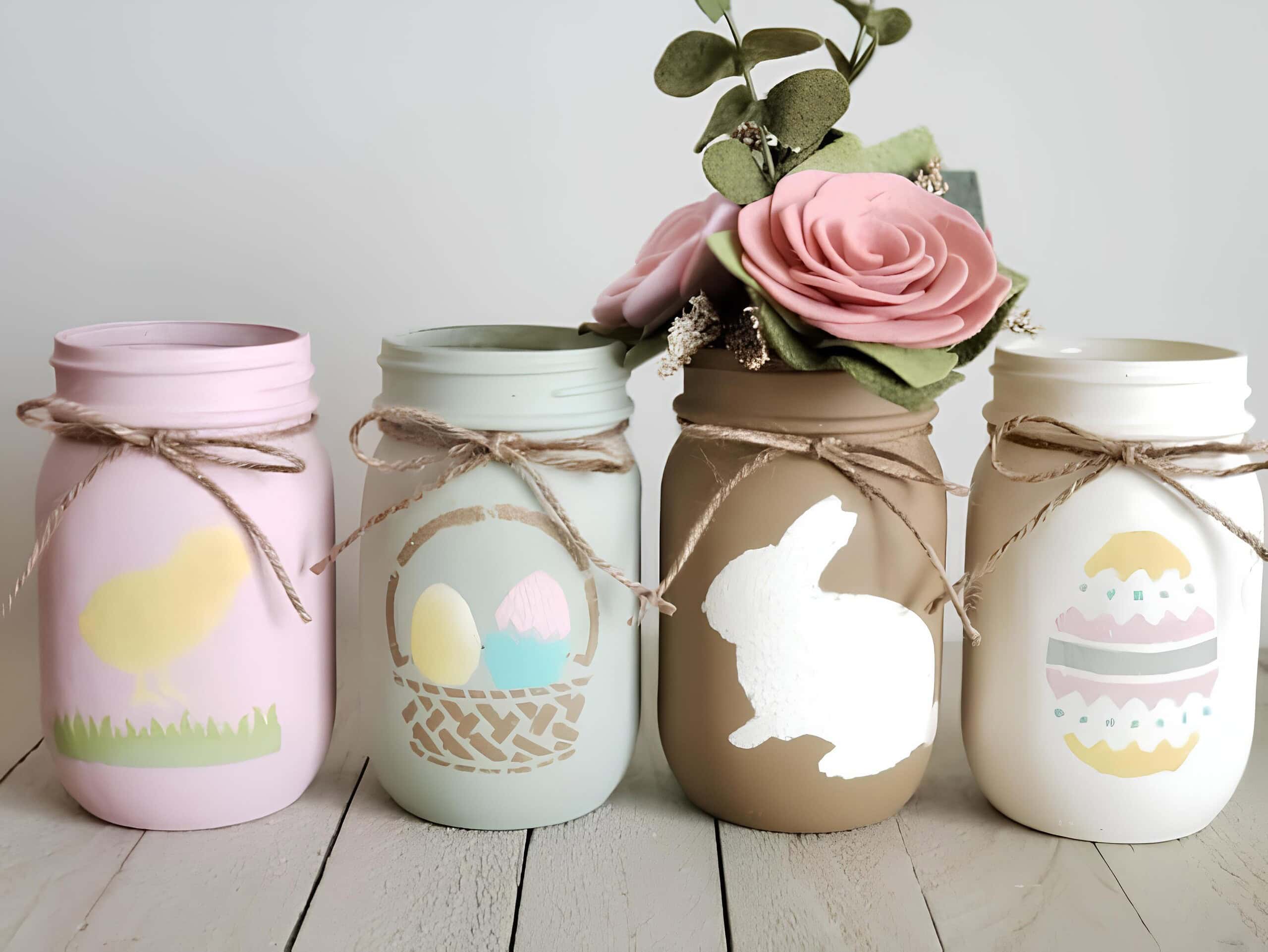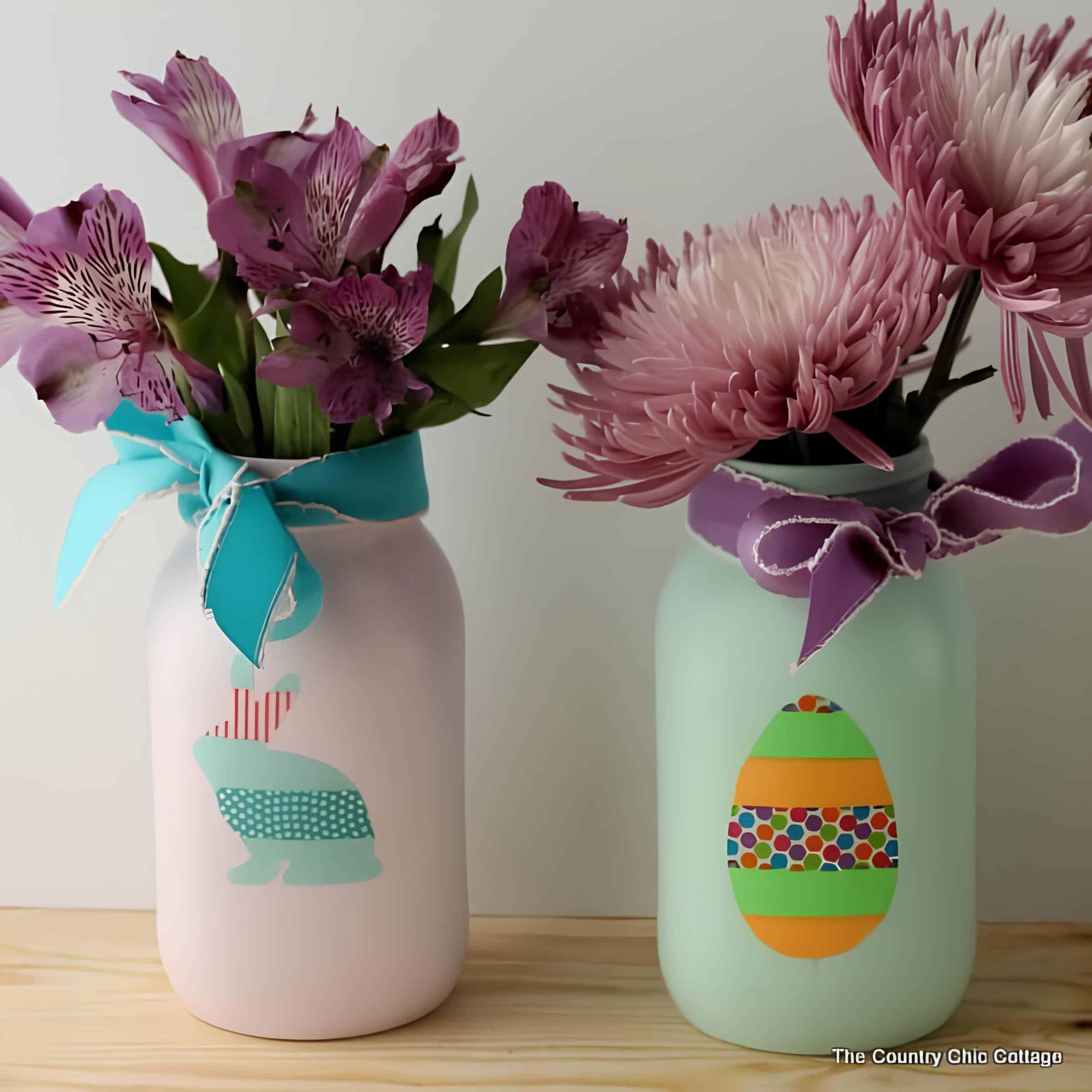 Colorful Easter Mason Jar Vases with Bunny and Egg Designs
