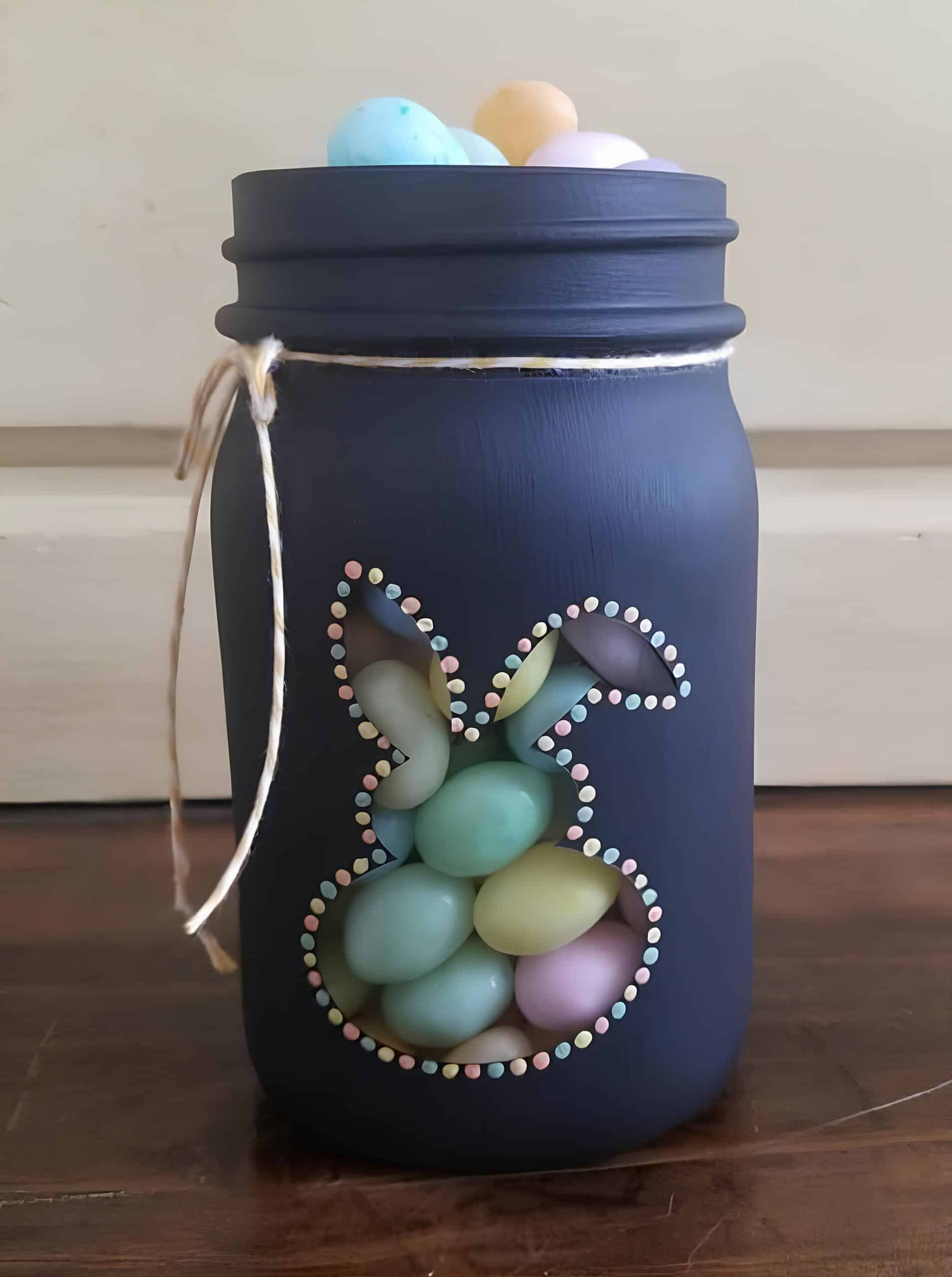 Dark painted Easter mason jar with bunny-shaped cutout filled with pastel eggs