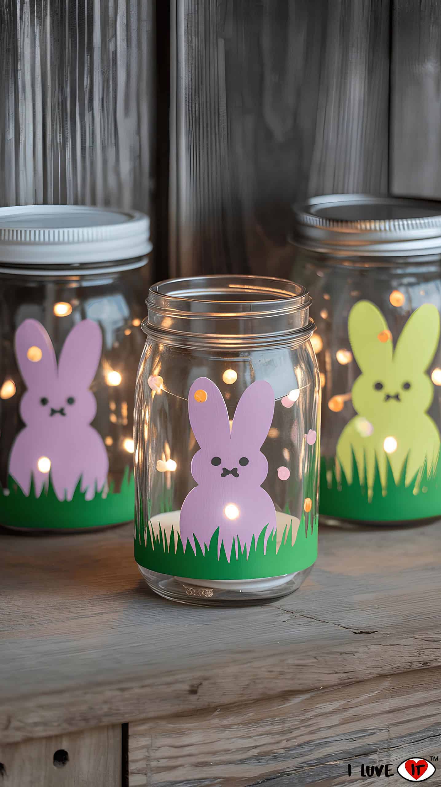 Create a magical Easter evening glow with these mason jar lanterns featuring pastel bunny silhouettes, green grass accents, and twinkling fairy lights.