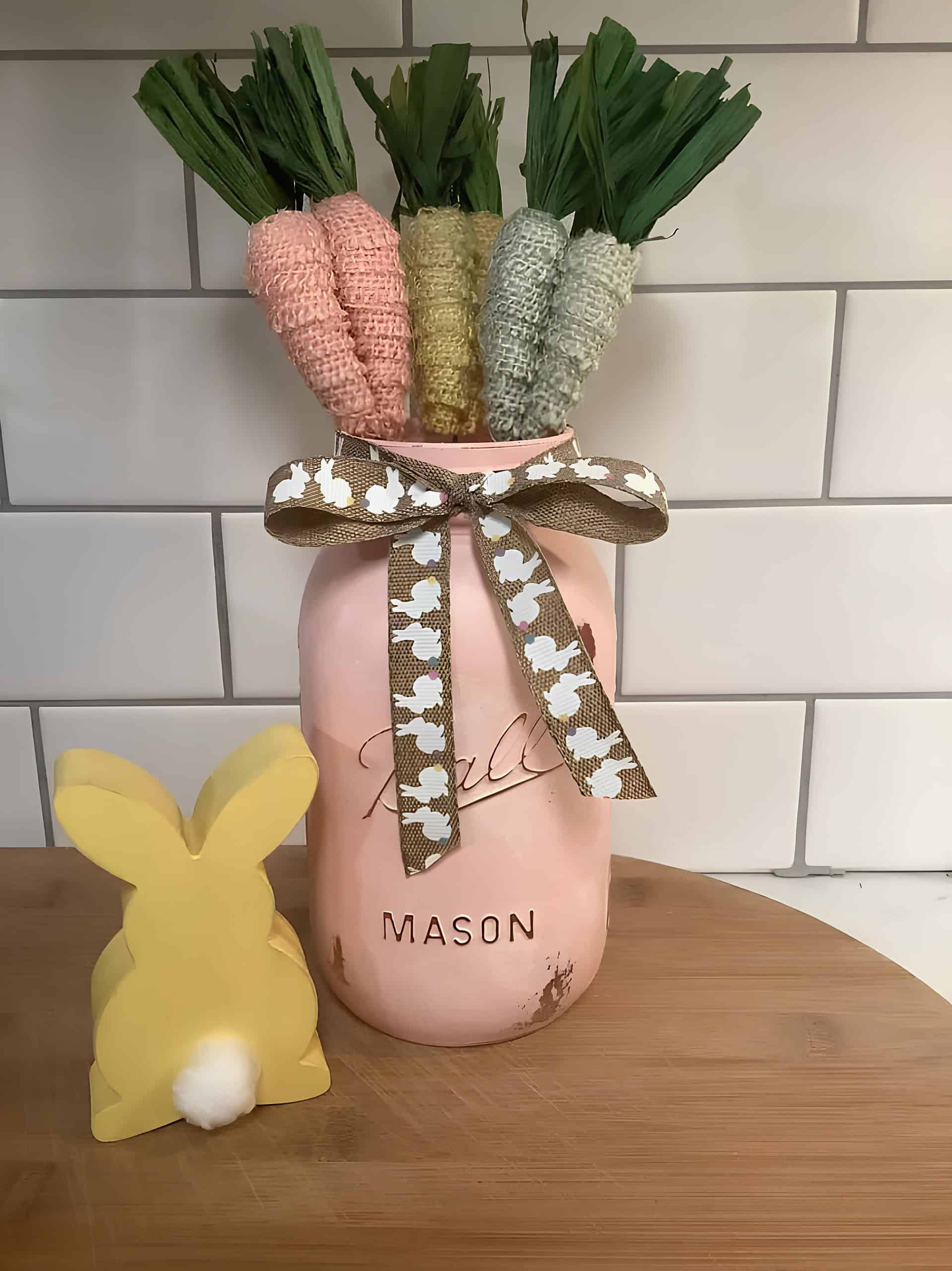 A charming farmhouse-inspired Easter centerpiece featuring a distressed pink mason jar filled with pastel burlap carrots and topped with a festive bunny ribbon—paired perfectly with a wooden yellow bunny.