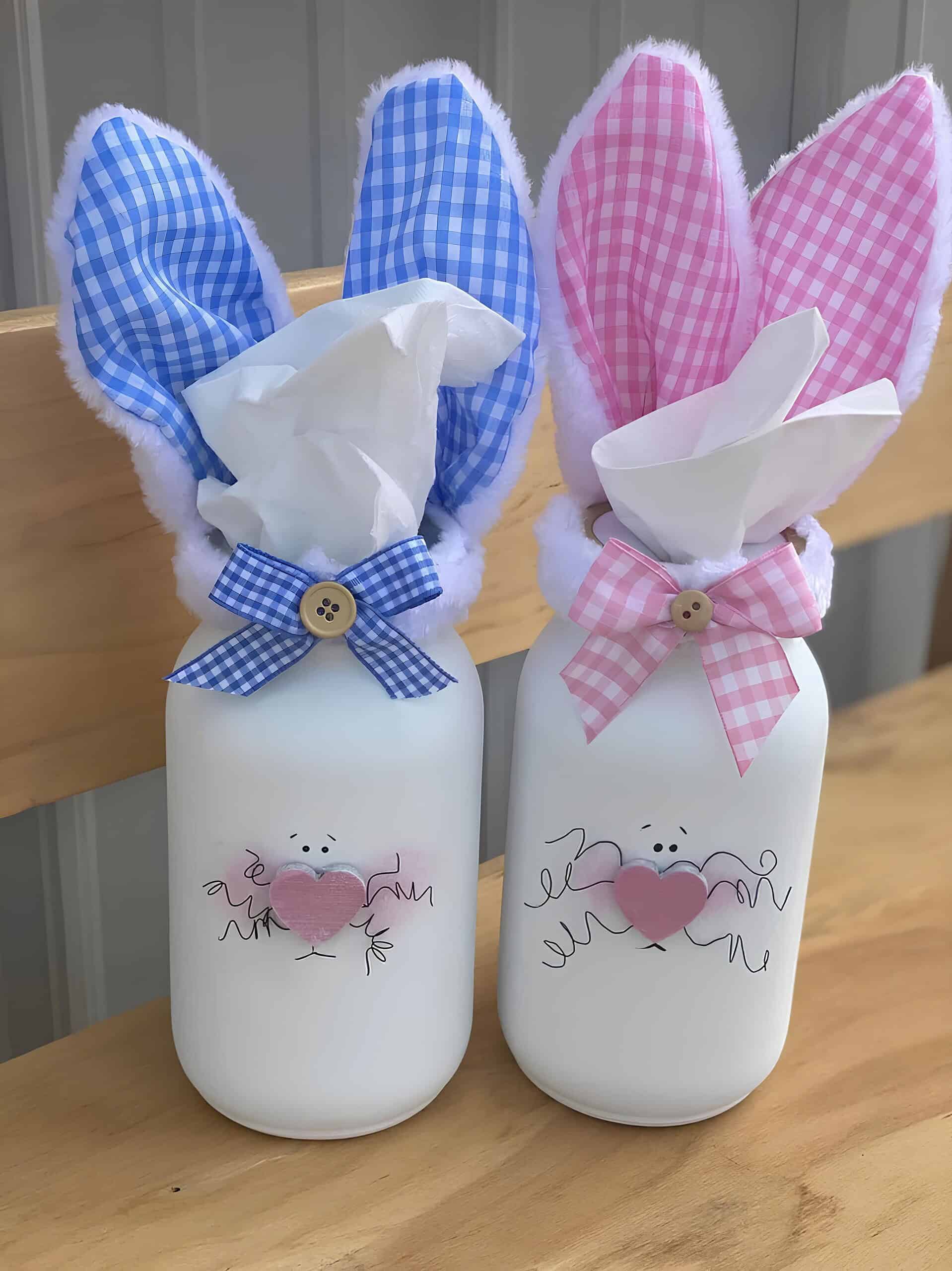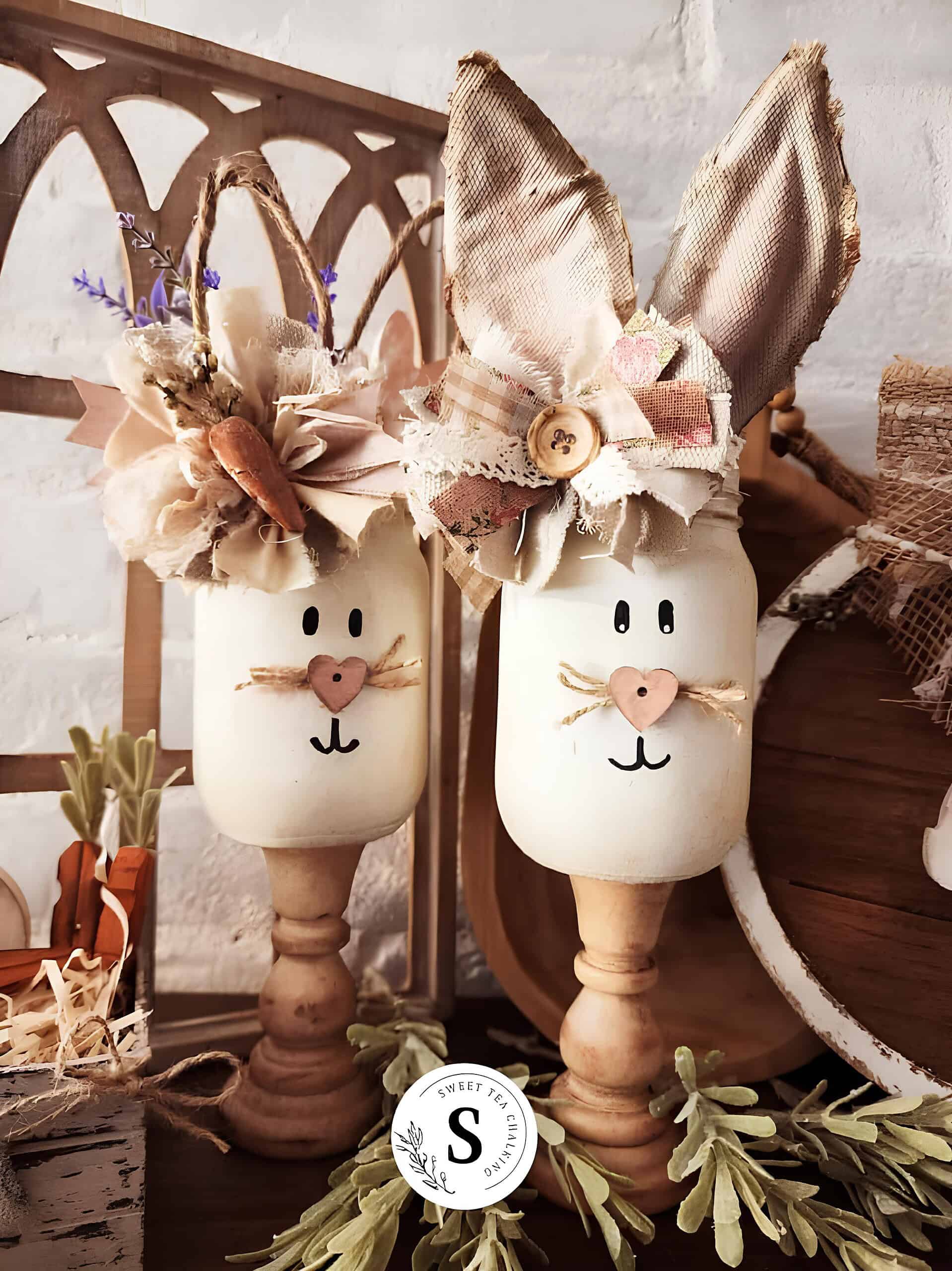 These rustic bunny mason jars combine farmhouse charm with whimsical Easter style — featuring fabric ears, button noses, and wooden bases.