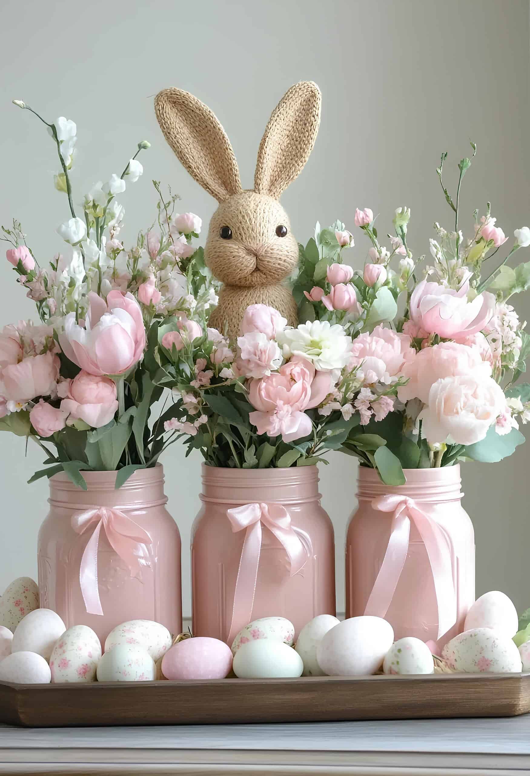 These pastel bunny mason jar vases are topped with spring florals and satin bows, offering a modern, soft take on Easter decor.