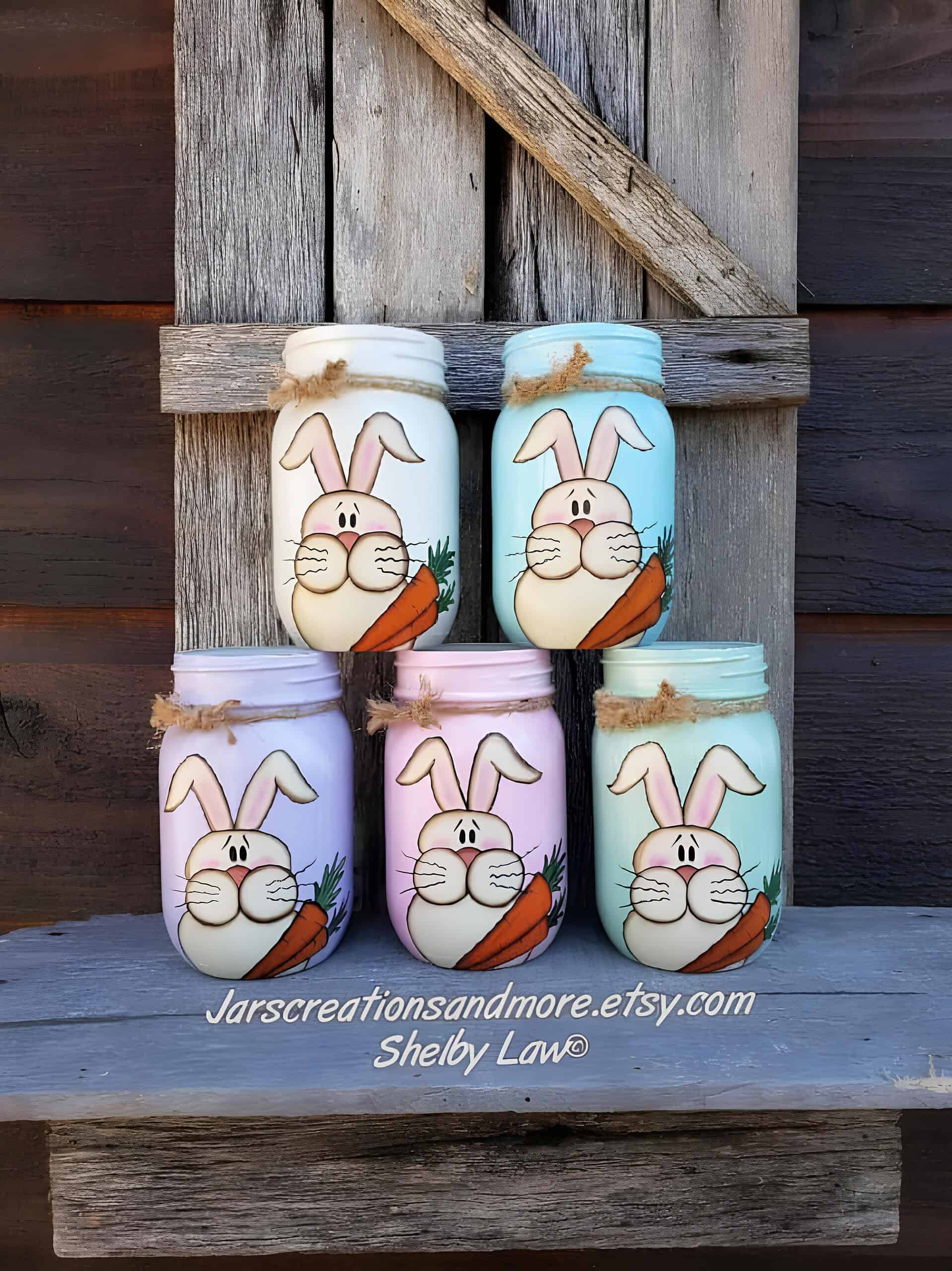 Hand-painted Easter mason jars with cartoon bunnies holding carrots in pastel colors