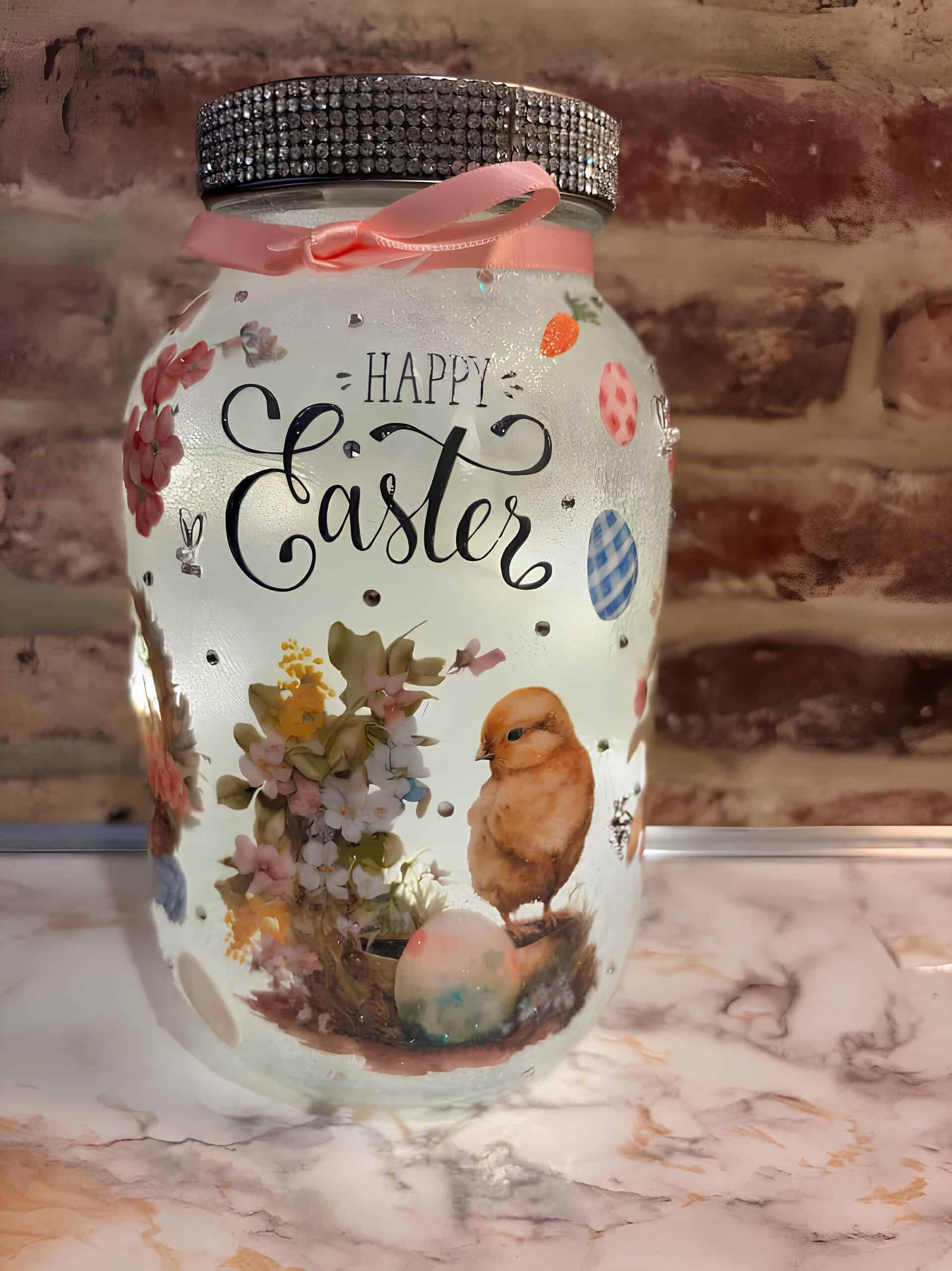 Frosted mason jar with Happy Easter text, chick and flower design, lit from inside with rhinestone lid and ribbon
