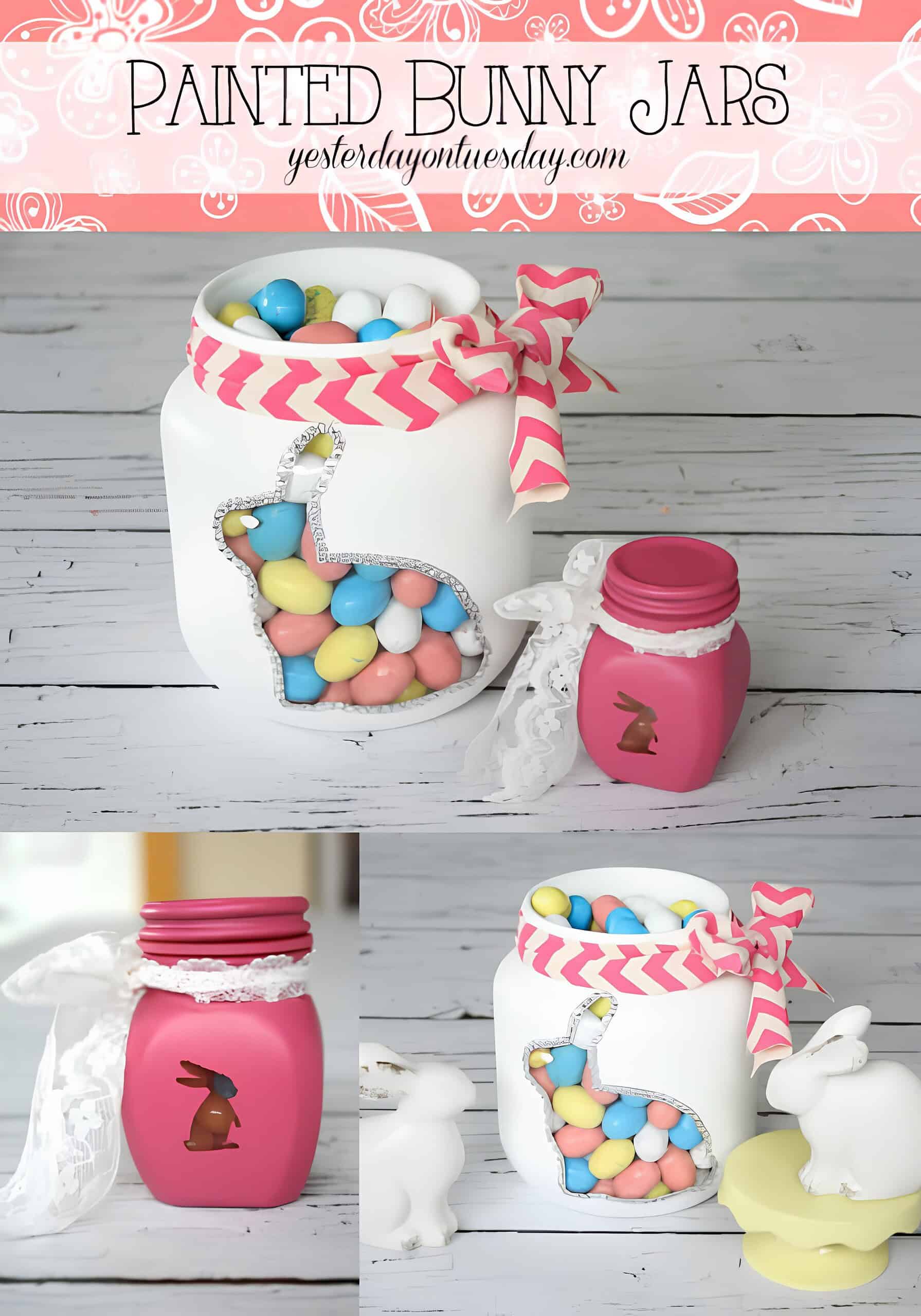 DIY Painted Bunny Jars with candy-filled interiors and cut-out bunny silhouettes, perfect for Easter gifts or table décor. Image via yesterdayontuesday.com
