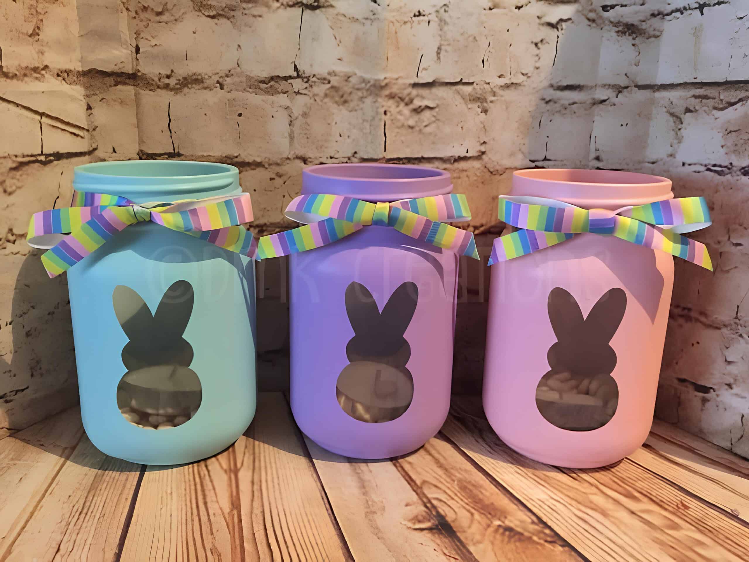 Easter Bunny Silhouette Mason Jars With Pastel Paint And Rainbow Bows