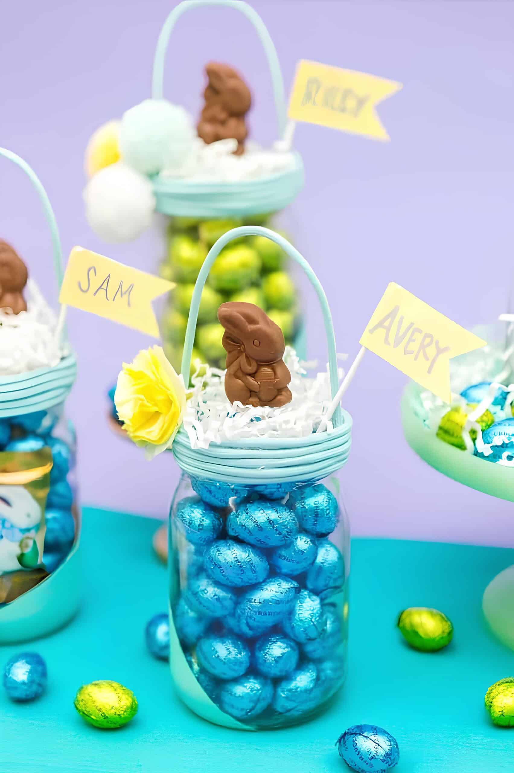 DIY Easter basket mason jars filled with candy eggs, chocolate bunnies, and name flags for kids