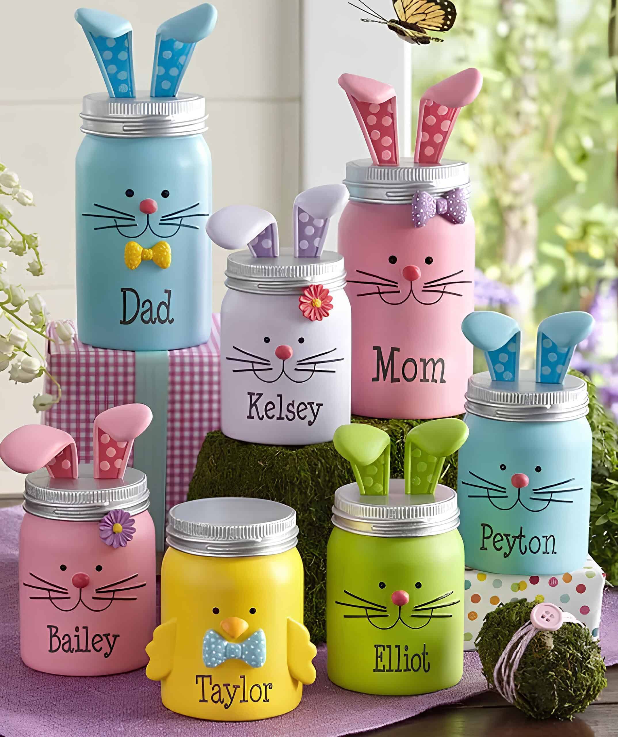Celebrate Easter as a family with these personalized mason jars, each decorated with bunny ears, spring accents, and the names of your loved ones—great for gifts or table settings.