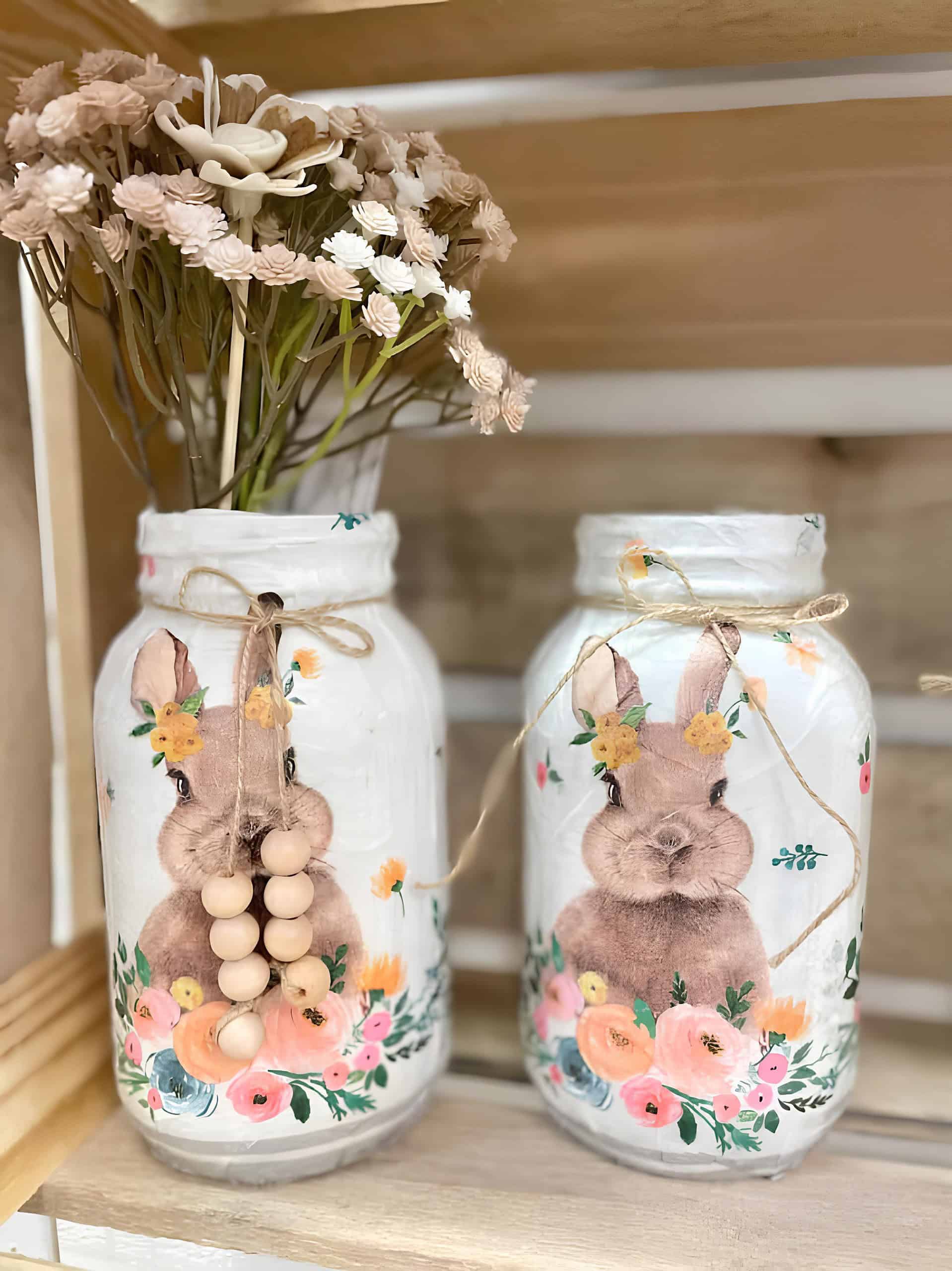 These hand-painted Easter bunny mason jars combine rustic charm with detailed florals, twine ties, and wooden bead accents — a standout spring display.