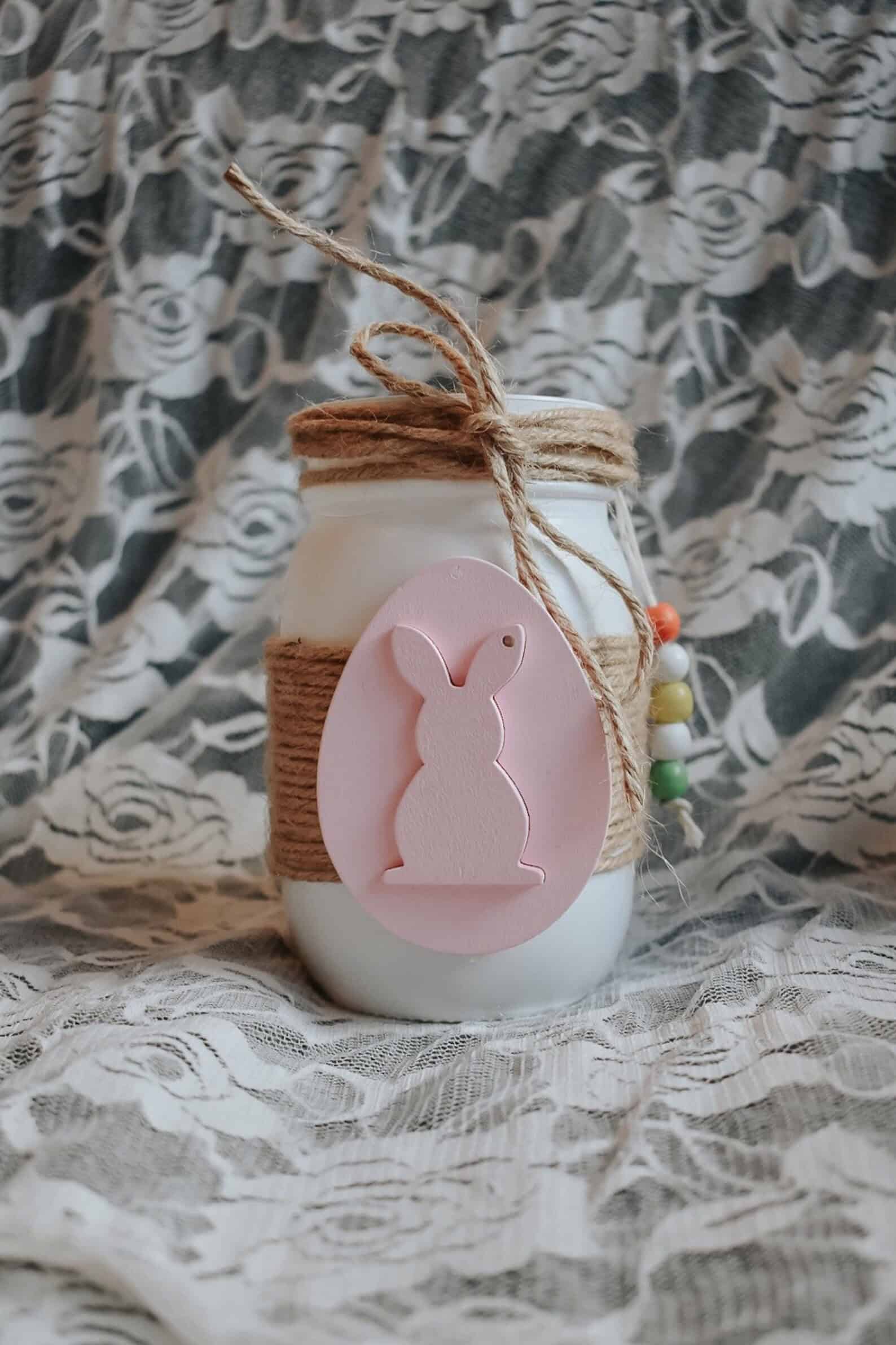 A simple yet charming Easter mason jar wrapped in twine and finished with a pink bunny egg tag — perfect for farmhouse spring decor.