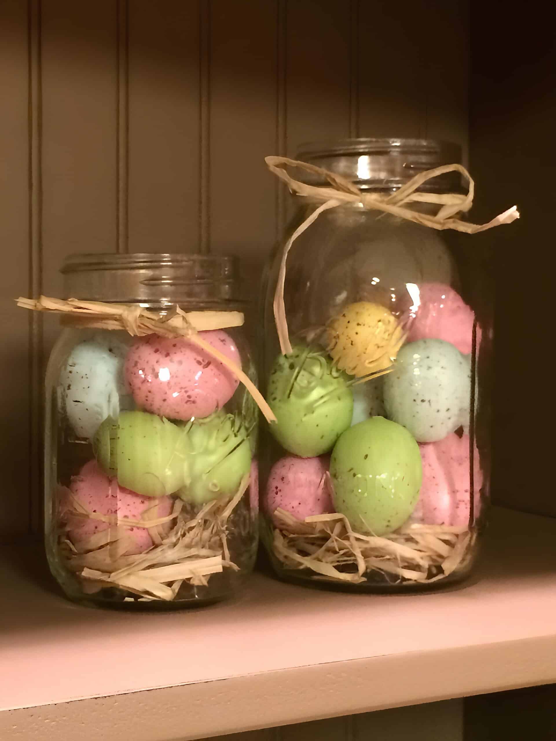 Clear mason jars filled with pastel speckled Easter eggs and raffia ribbon